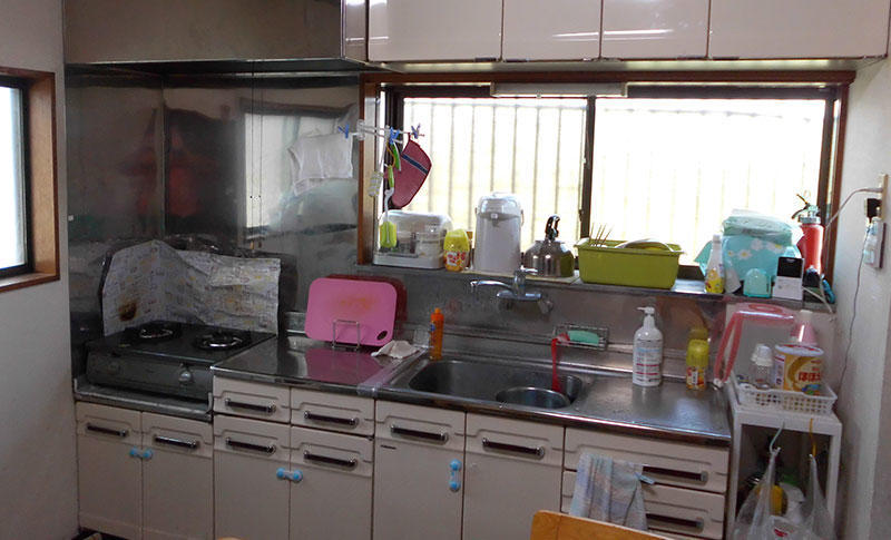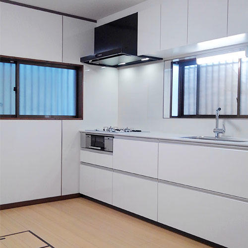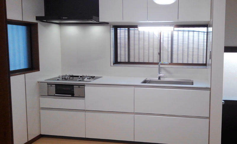 元々はご主人のご両親と一緒に暮らしていましたが、ご両親と別々に暮らすことになった為、老朽化したキッチンを若奥様ご希望のシステムキッチンに取替し、キッチン全体をリフォーム。キッチン全体が明るくスタイリッシュに統一され、ご希望通りの使いやすいシステムキッチンを取付する事が出来ました。