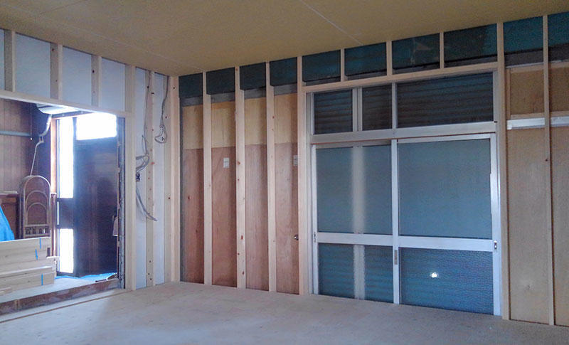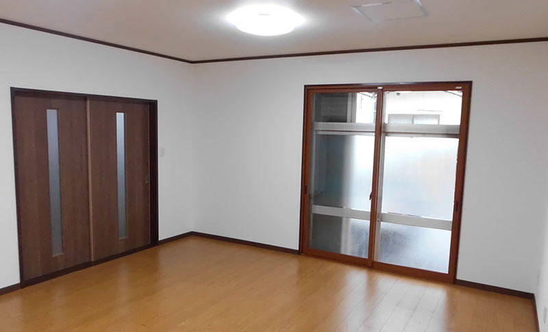 約50年前の住宅で断熱性もない為、冬は非常に寒く、玄関に入ってすぐのホール約6帖を居住スペースとして使用していました。台所(3帖)・リビング(6帖)・物置(16帖)この空間がすべて壁で仕切られ独立した部屋になっていたため、壁を取り除き建具を付けることにより、行き来が楽になり、開放的で使いやすい空間にすることができました。空き部屋だった16帖の部屋には床壁天井に断熱材を敷き詰め、窓には道路沿いということもあり防音性・断熱性を兼ねたインプラスを取付、明るく広く使いやすい一体化した居住スペースを実現しました。