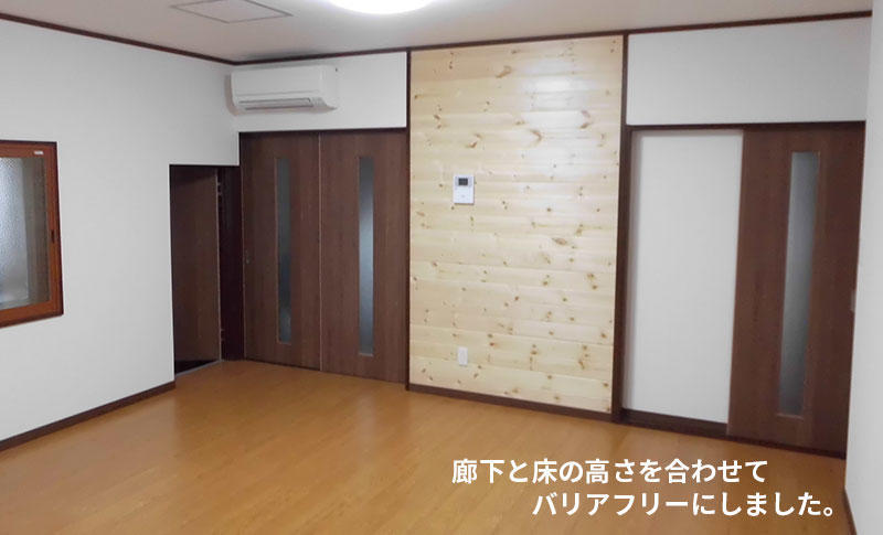 このお宅は2人とも65歳以上の高齢、工事内容がバリアフリーも含まれていたため、市へ介護住宅改修工事の申請を行い補助金を一部もらい施工しました。弊社ではこのようなご提案をしながらお客様とリノベーションを行っています。