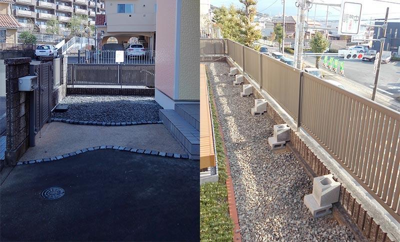 駐車場スペースに花壇がありましたが、花壇を撤去し駐車スペースを広げ、防犯対策として可動型(埋込収納型)ポールチェーンを取付しました。フェンスはお客様支給で、気になる視線部分のみ取付。高台ということもあり強風を考慮し基礎には十分配慮し施工しました。スチール物置は玄関横ということもあり、お客様ご指定のイナバ物置(ナイソーシリーズ)。見た目もオシャレで違和感のない感じに設置することができました。