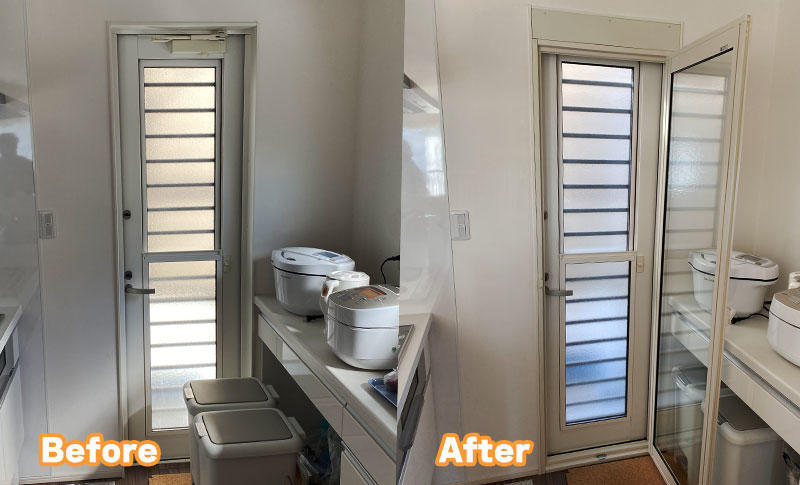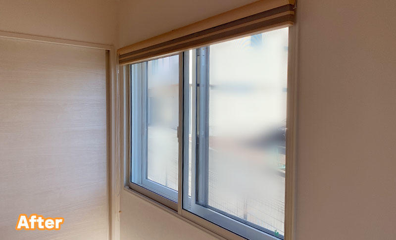 近隣騒音(車ドアの開閉音、交通音など)が気になるというご相談でした。趣味部屋とリビングへの騒音侵入経路に対し、インプラス(内窓)を使い騒音対策を行いました。1Fの窓、キッチン勝手口にもテラスドアタイプのインプラスを設置。2Fのトイレ、洗面所と合わせ12カ所にインプラスを設置しました。外壁部に比べ、どうしても開口部(窓・換気口・ドア)は遮音性能が不足します。インプラスを使うことで、窓部の遮音性能が外壁部と同程度になります。