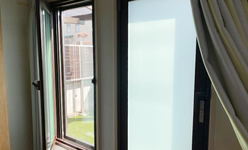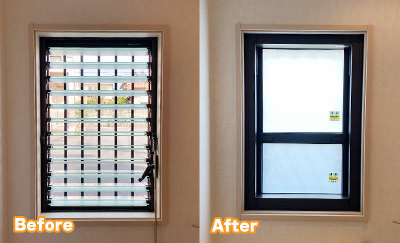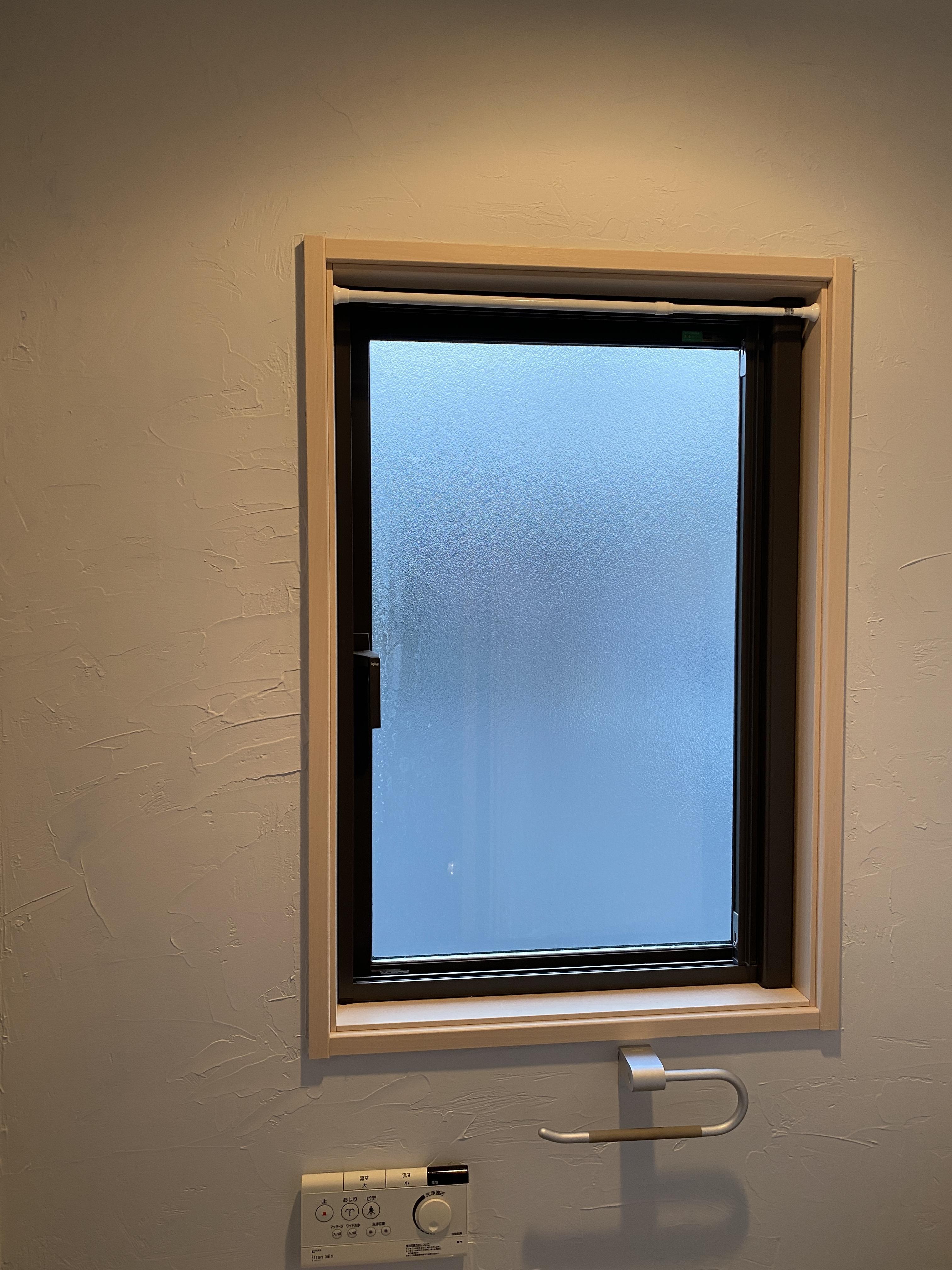 リビングにある開き窓2カ所をインプラスにて2重窓に。2重窓にすることで断熱性・防音性が高まります。また、窓に乳半色ガラスを採用し明るさを取り込みつつ、外部からの視線をカット。カーテンを開けていられるように。トイレのルーバー窓部はハンドルが干渉しインプラス施工ができないため、サッシを外し窓を取り換えるリプラスを採用。枠ごと断熱仕様にしトイレでの寒さを解消しました。
