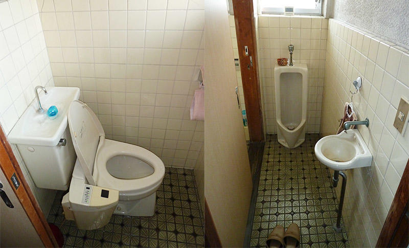1Fをまるごとリフォームした際に、お客様のご要望に合わせてトイレルームを拡張。大便器、小便器と分かれていた空間を1つにし、スッキリと清潔にをコンセプトにタンクレストイレ・手洗い収納・におい対策にエコカラットを使用しました。