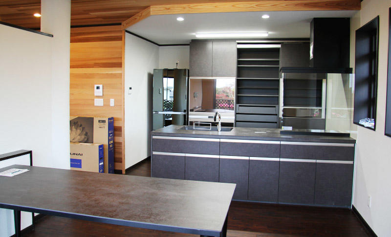 1階全体をリフォームしました。モノトーン・木目・清潔感をキーワードにコーディネイト。キッチン・収納共にリクシル製リシェルを使用。リクシル製キッチンの最高級グレードを設置、セラミックトップ、収納など「こだわり」がいっぱい詰まったキッチンになりました。