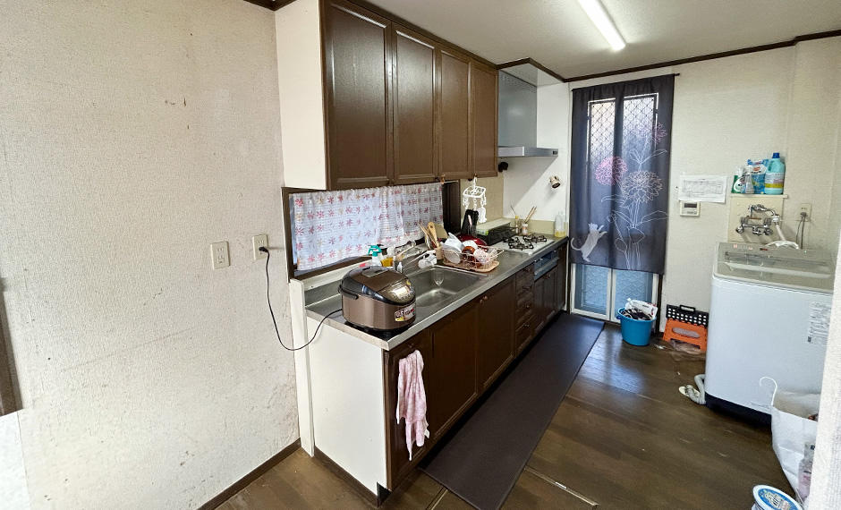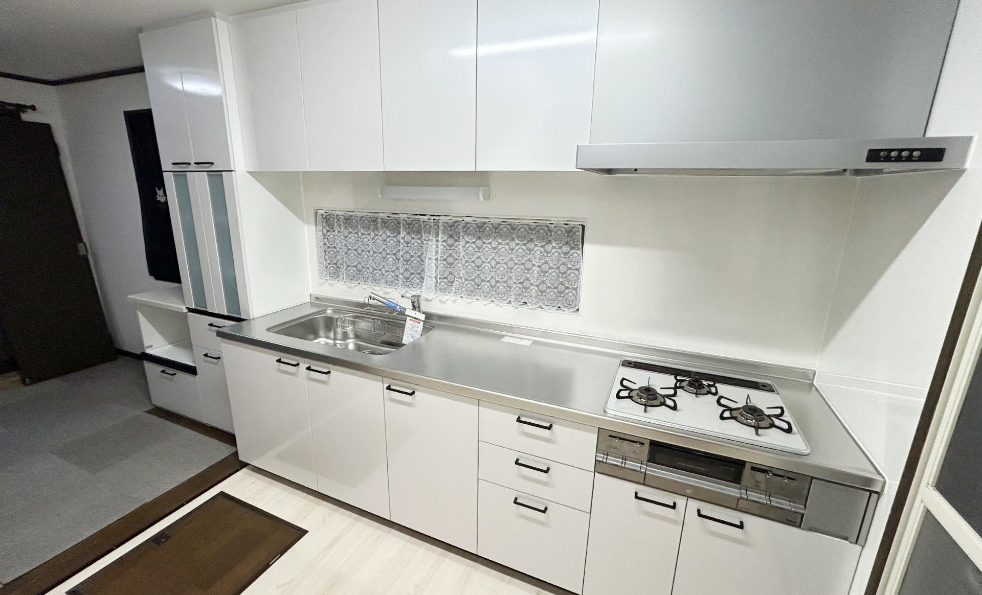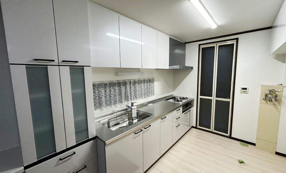 キッチン部分はキッチン+洗濯場・収納を兼ねていたため収納力をアップさせ、使いやすく機能的に配慮しました。お施主様が非常にきれい好きの方でしたので吊戸棚・キッチン家電収納・棚板等を新設することで非常に整理しやすくいつでもスッキリできる収納を提案しました。