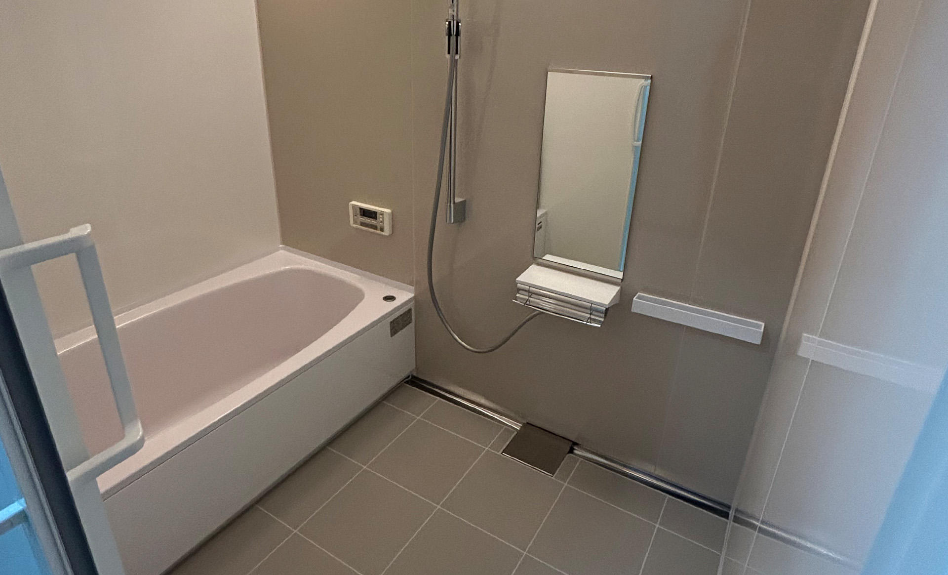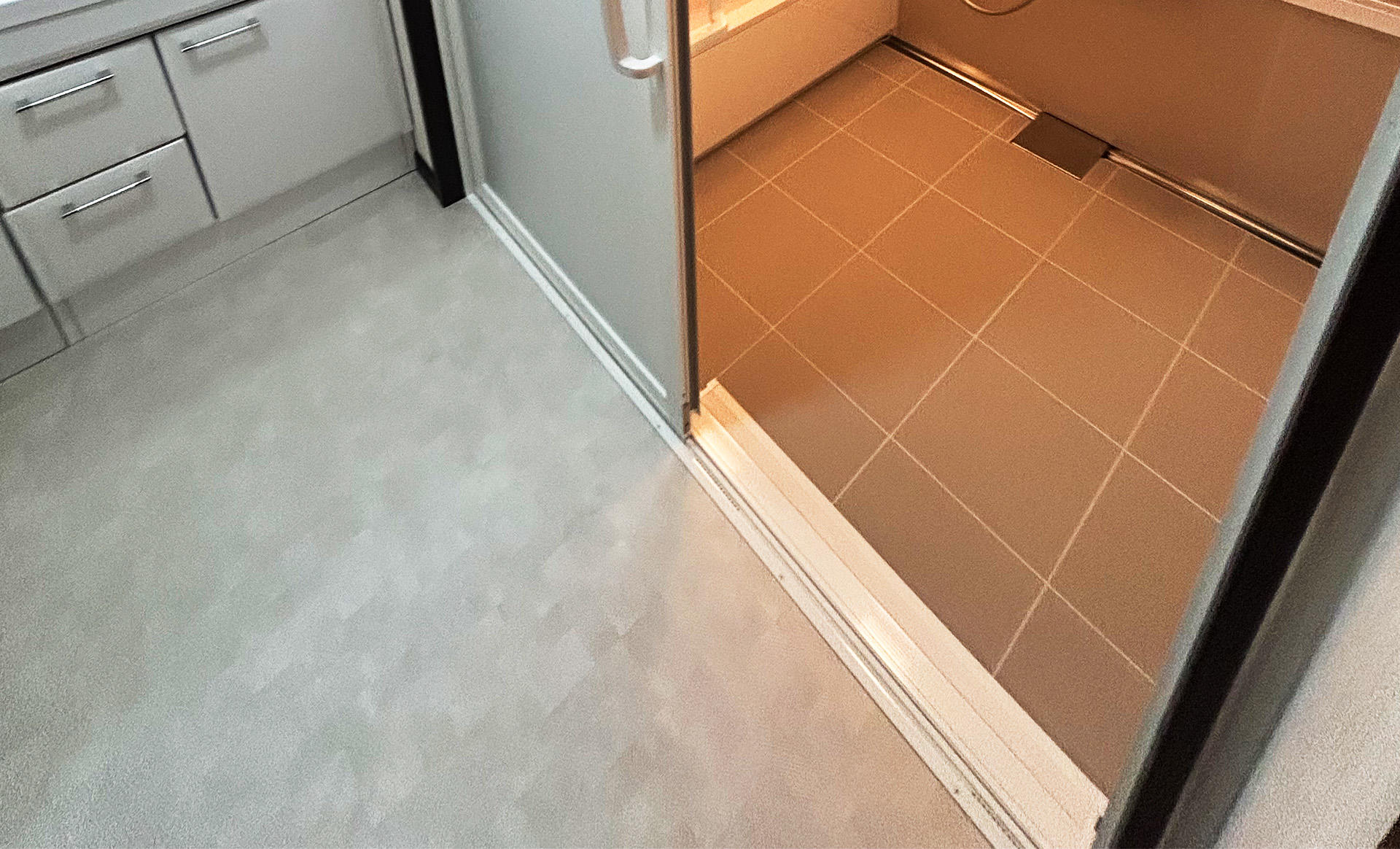 浴室は元々脱衣場との段差が約20cmあり毎日の上がり降りに不備を感じていたため、浴室床下を改良し段差を無くし出入りしやすい浴室を実現。