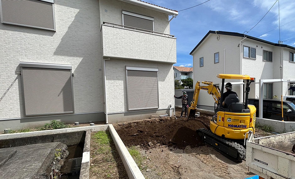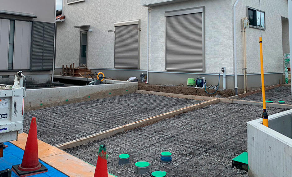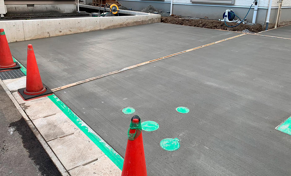南側前面道路から住宅部分の高低差がかなりある状況。現状なりに土間コンクリートを施工するとかなりの急勾配になる為、一部見切りブロックを施工しながら駐車場部分の土をかなり鋤取り、路盤を下げ車が乗り入れしやすくお施主様も乗降しやすい駐車場になりました。