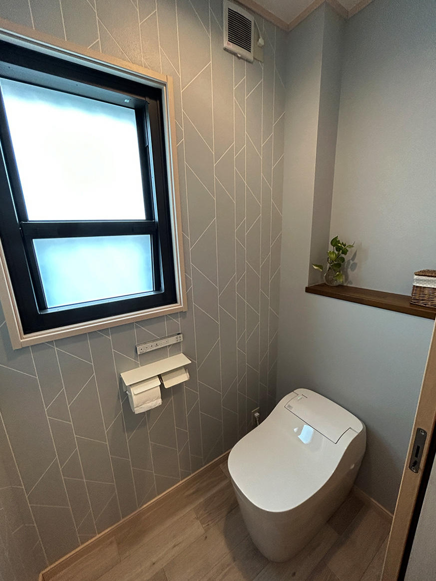 手洗い用のタンクもほぼ使わないため、思い切ってタンクレスタイプを採用されました。タンクが無くなりスッキリ。壁紙、床材が変わり印象が変わりました。いかにも普通だったトイレ空間がオシャレに生まれ変わり、大満足していただけました。