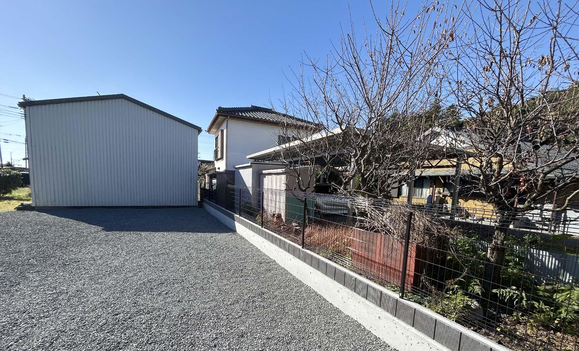 測量士さんが隣地との境界ポイントをしっかりと出してくれたため、それに従いお話しいただいたお客様の境界線より内側にコンクリート見切り+化粧ブロック積+メッシュフェンスh1000を施工しました。離れ解体後の整地は 重機にて一度不陸整正し路盤作成。 草生え防止策として防草シート敷き込み、砂利(6号砕石)を敷き込みました。
