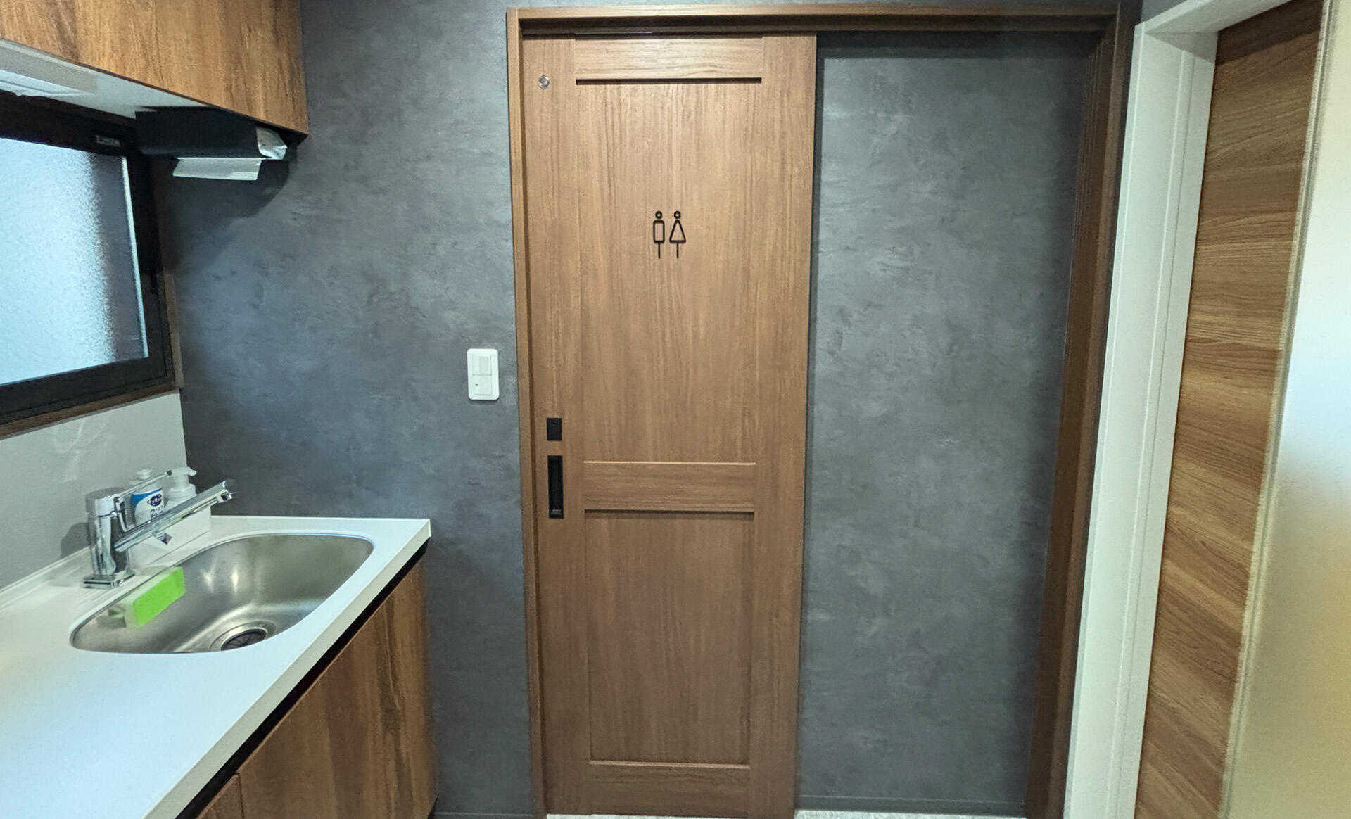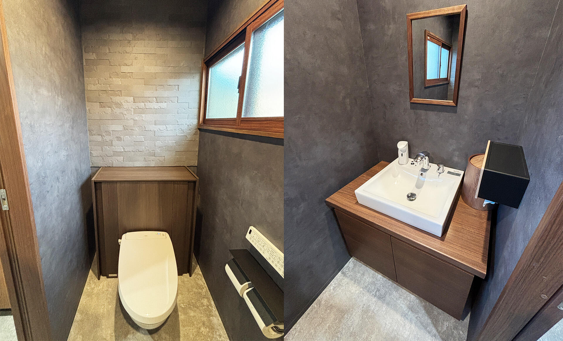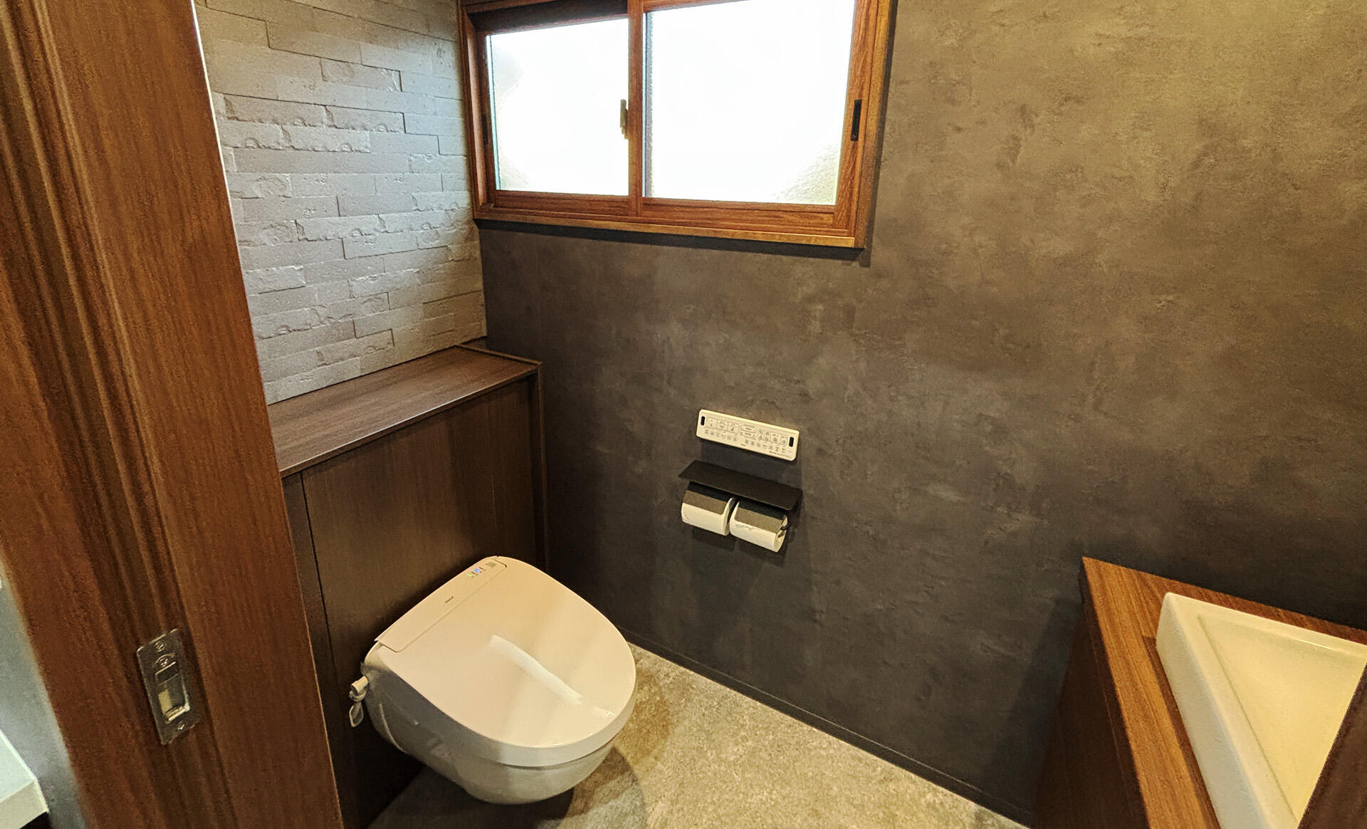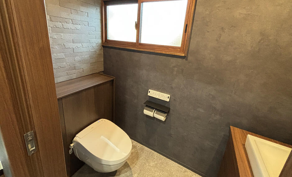 古さの残る和式トイレを洋式へ変更し、手洗いの新設や内装・建具・内窓まで含めて空間全体を見直しました。ダークトーンと木目で統一し、来客時にも印象の良いホテルライクなシックモダン空間を目指しています。フロートトイレの採用により、見た目のすっきり感だけでなく床まわりの掃除のしやすさにも配慮しました。 工事詳細はこちら
