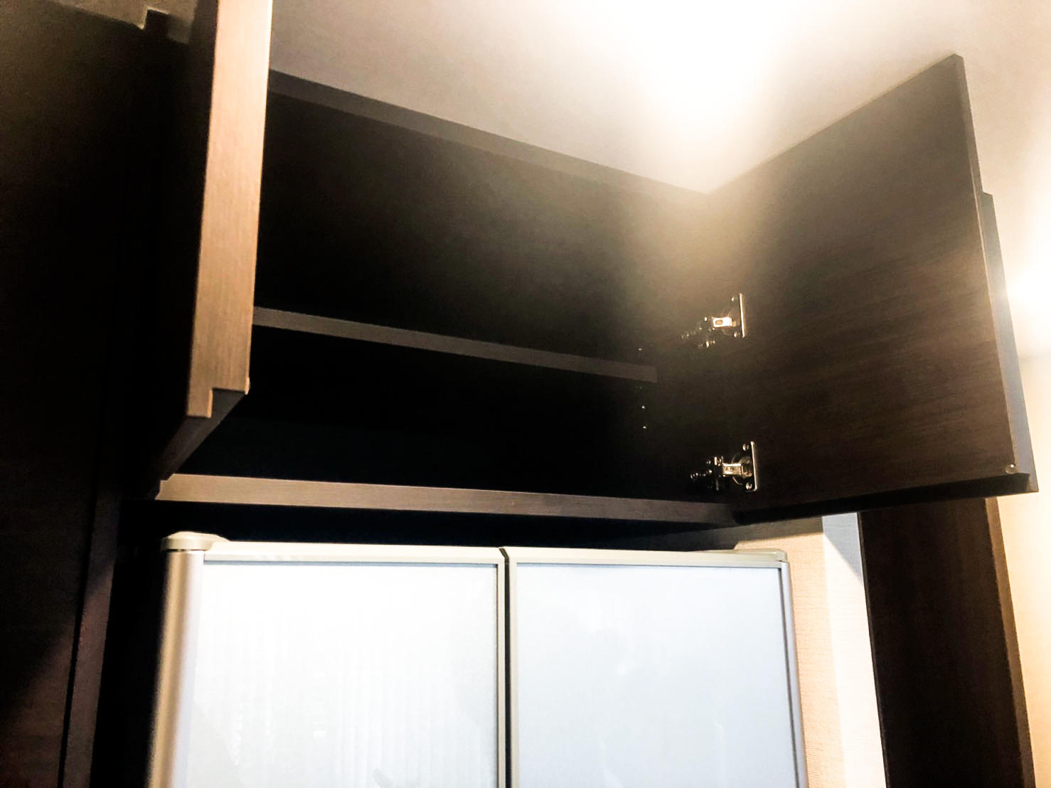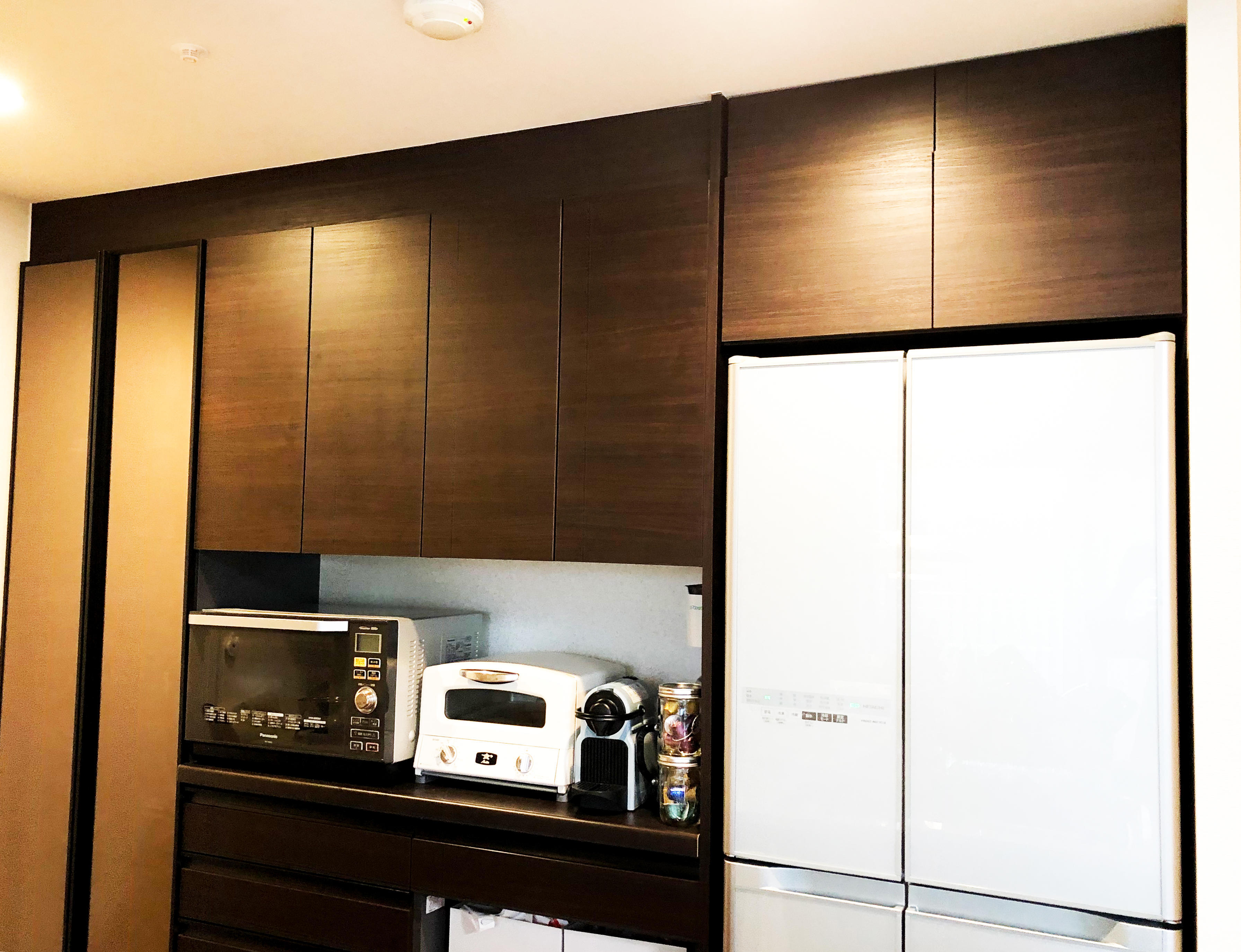 新築マンションに引っ越しされたばかりのお客様で、購入されたキッチン収納では容量が足りず物が至る所にあふれてしまっていました。既存のキッチン扉のウォールナット色にあわせて、リシェルのカップボードを取付しました!冷蔵庫上の収納は造作家具で、面材もリシェルにそろえてスッキリと、大容量の収納スペースへと変身することができました。