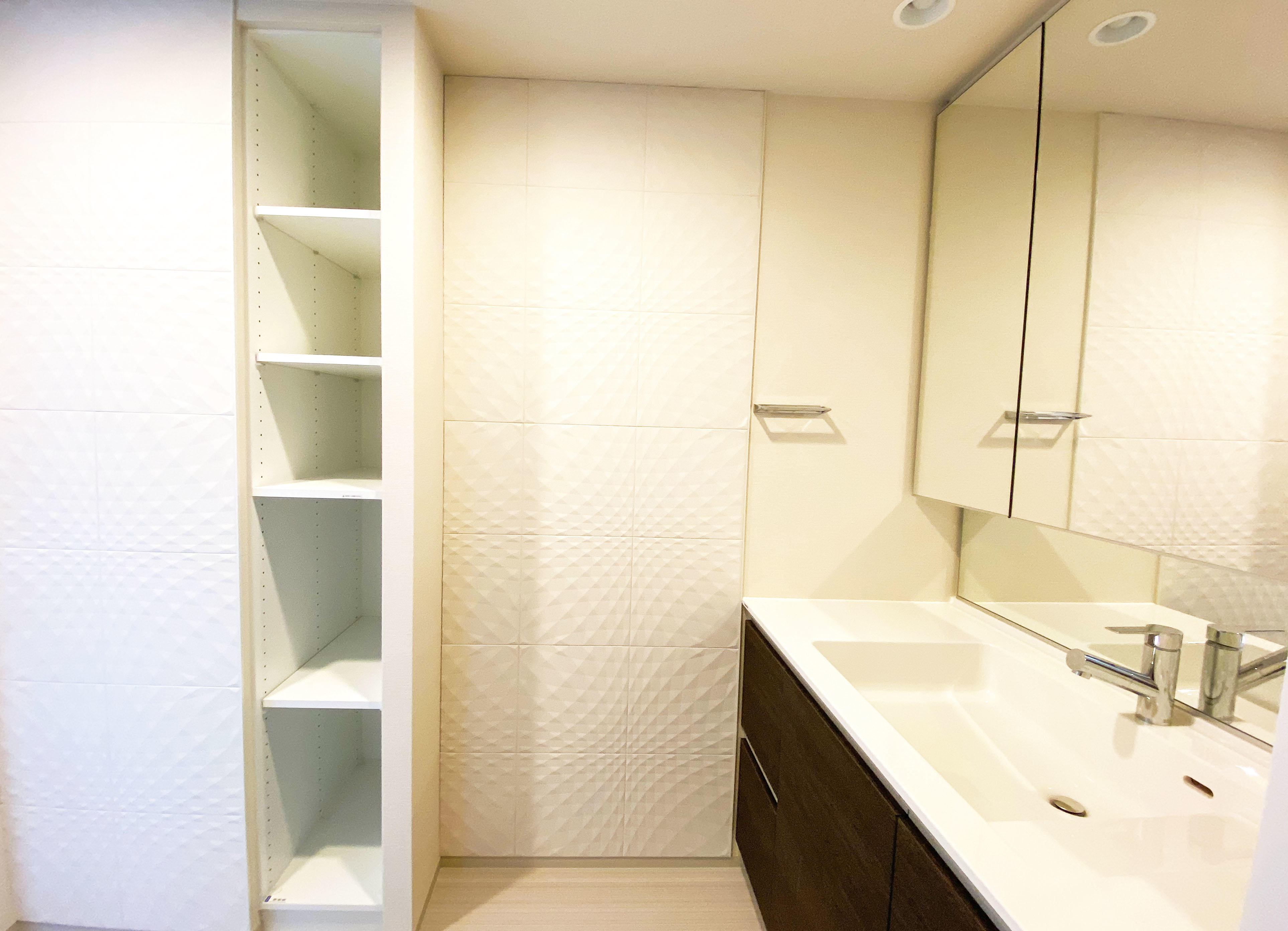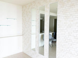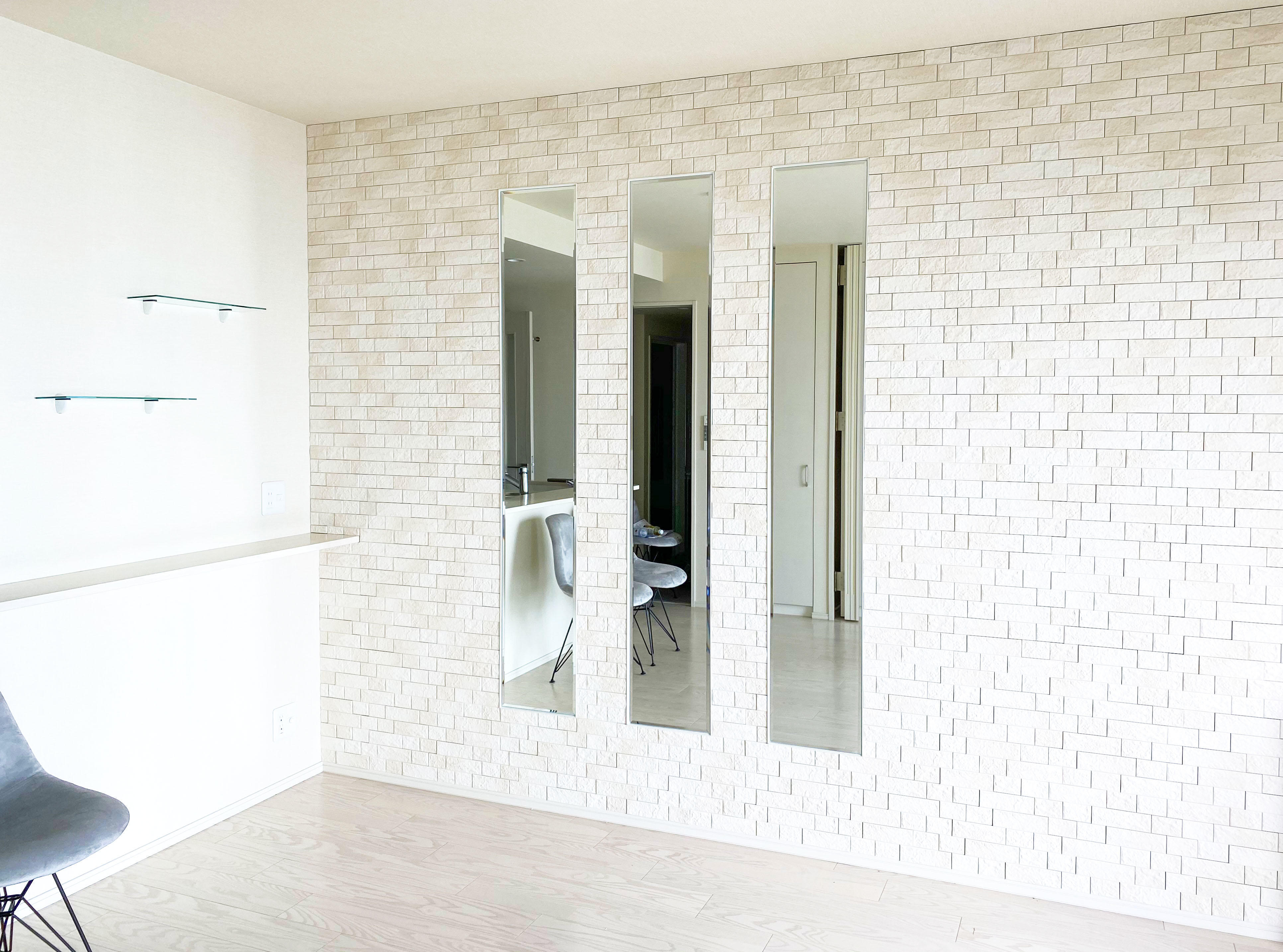 リビングには人気のグラナスヴィストを選定し、ミラーも付けたいと要望がありましたので、エコカラットとミラーの位置関係、ミラーの設置場所を考えました。一面にエコカラット貼り付けられているよりもミラーから見える景色に抜け感が出て、素敵な雰囲気になりました。