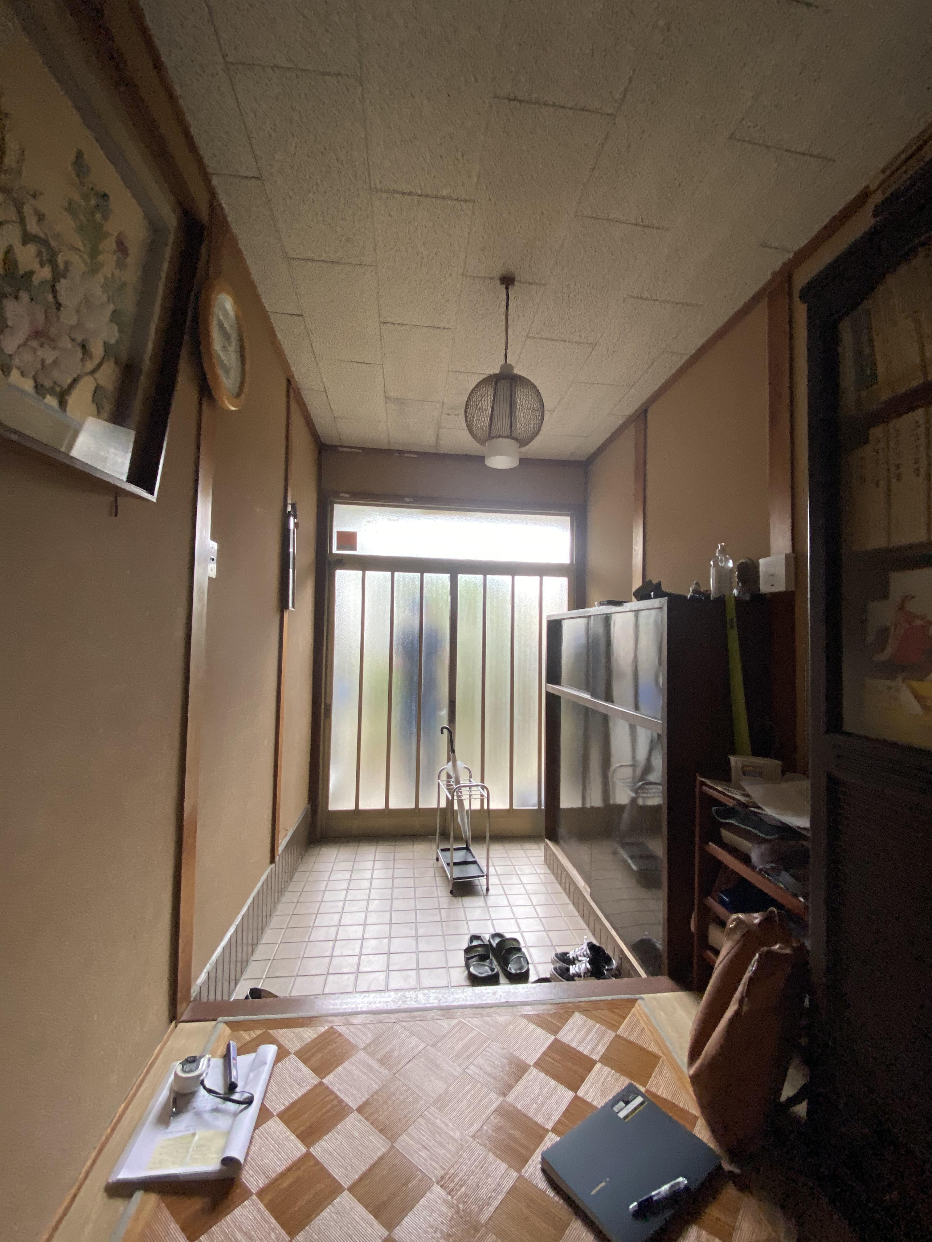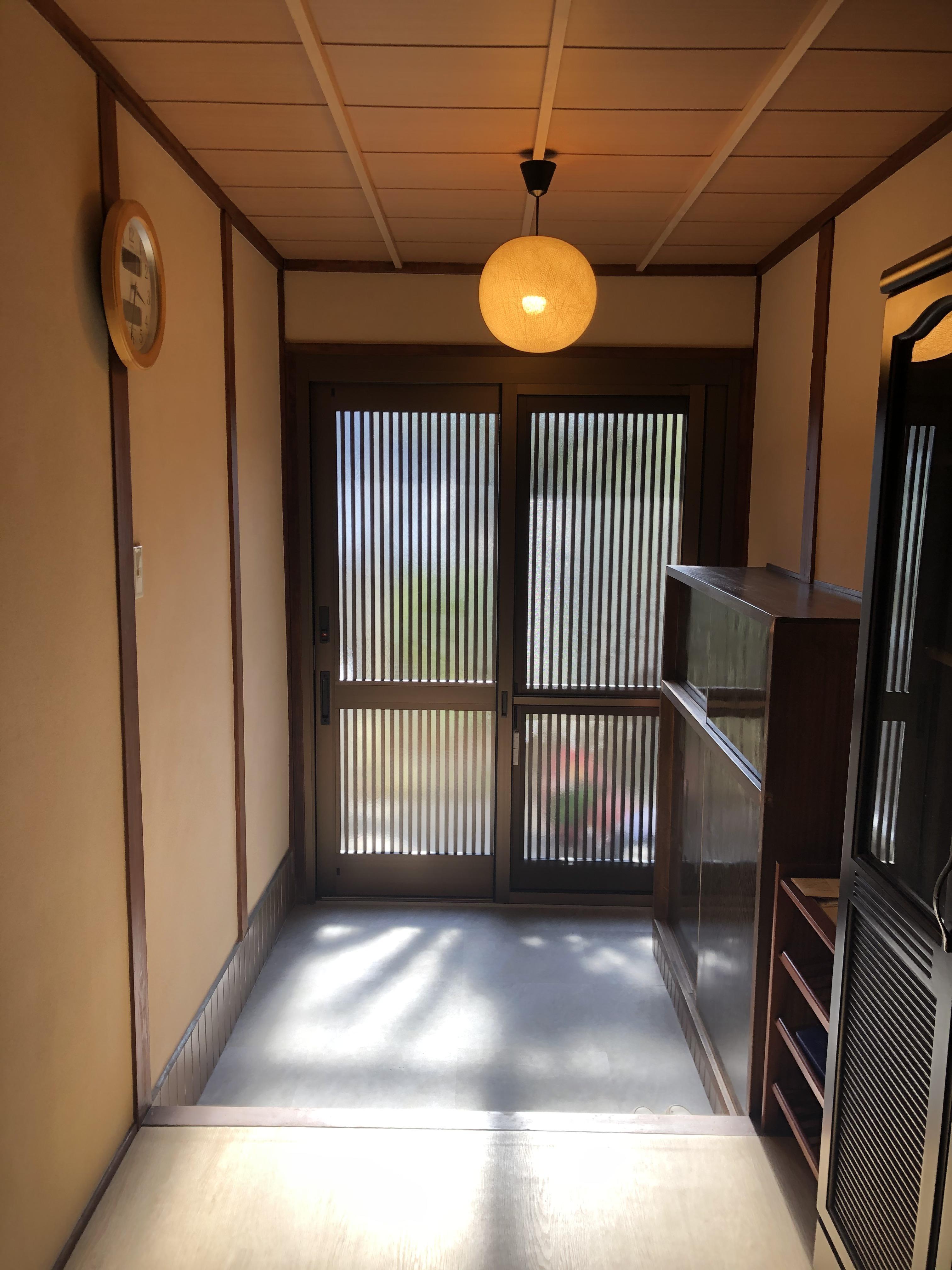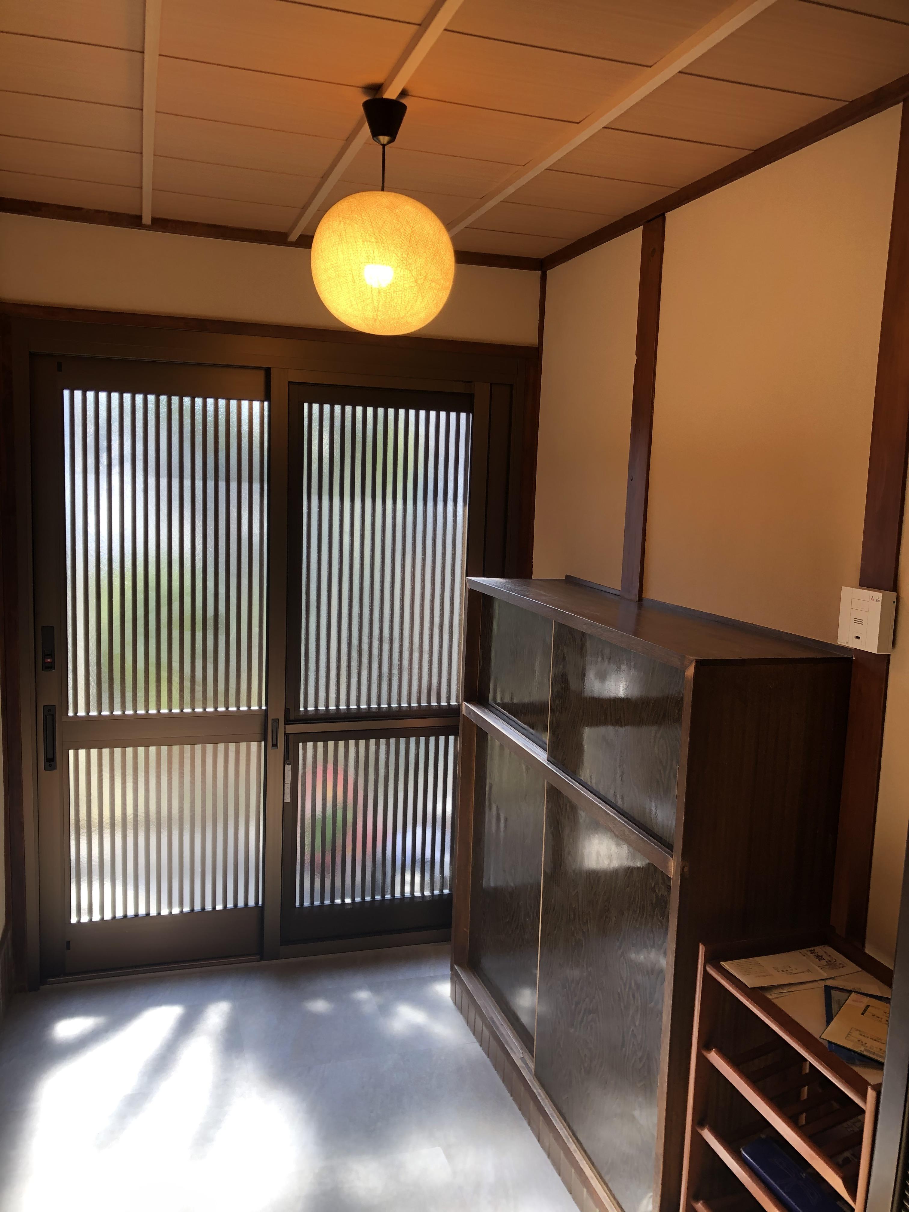 少し古くなってきた玄関部分と、トイレ部分のリフォーム工事となりました。 天井・床・玄関扉も全てを新しく変え、特に壁の聚楽壁が剥がれてきていたので、一旦全て剥がした後に、新たに聚楽壁を塗り、綺麗に仕上がりました。 トイレは狭く古かったため、新たに内部に壁を起こし、洋風のトイレ空間にしつつ、間仕切りなどを外して広い空間を造りました。