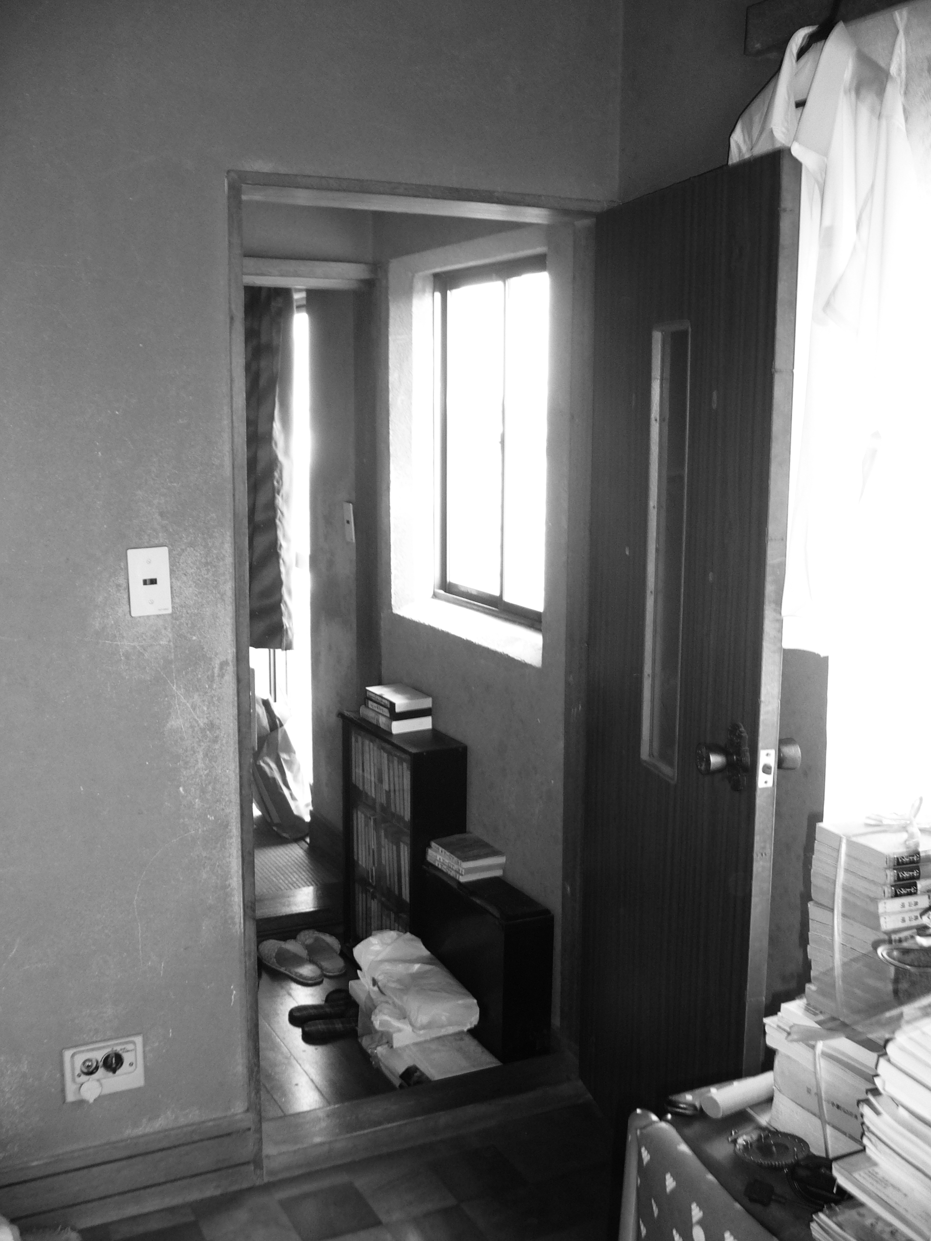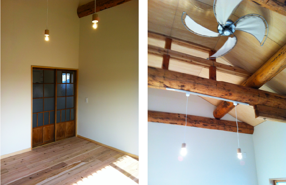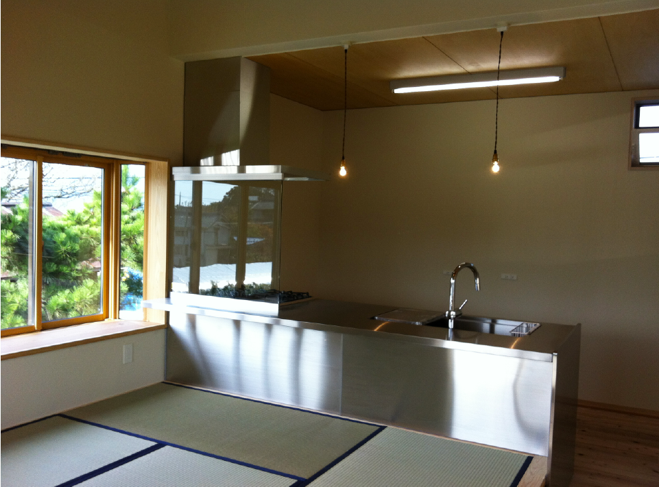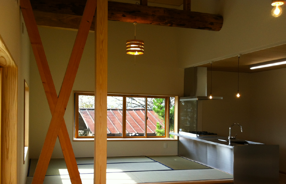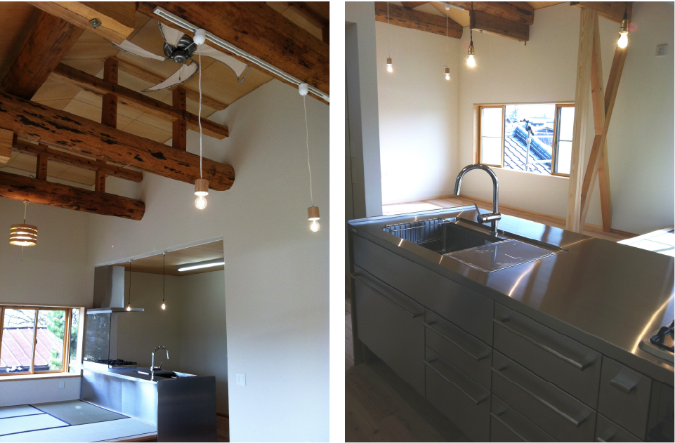二世帯が心地よく暮らすため、2階にキッチンなど水周りを増設。改装しました。LDKのテーマは「昭和レトロ」。既存の天井張りを取り払い、既存の梁をそのまませることで懐かしさと開放感を与えました。経年変化で色づいた丸太が、空間に落ち着きを与えています◎