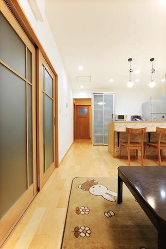 有効に断熱するため窓を小さくした分、とにかく明るさが欲しい!とのことで、床色はハードメープルで軽さのある明るいイメージに。建具は柔らかいペールカラーとして、全体を優しい印象に仕上げました。