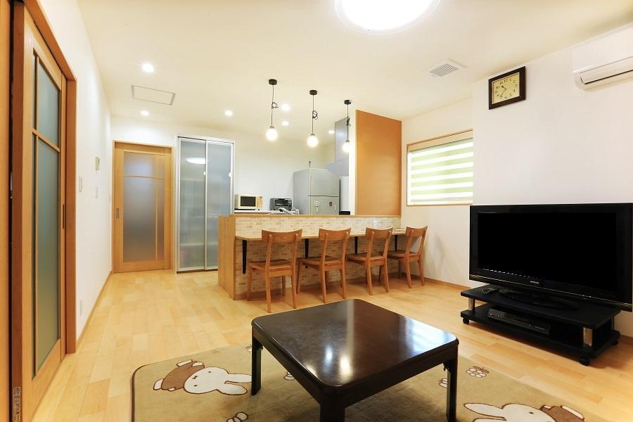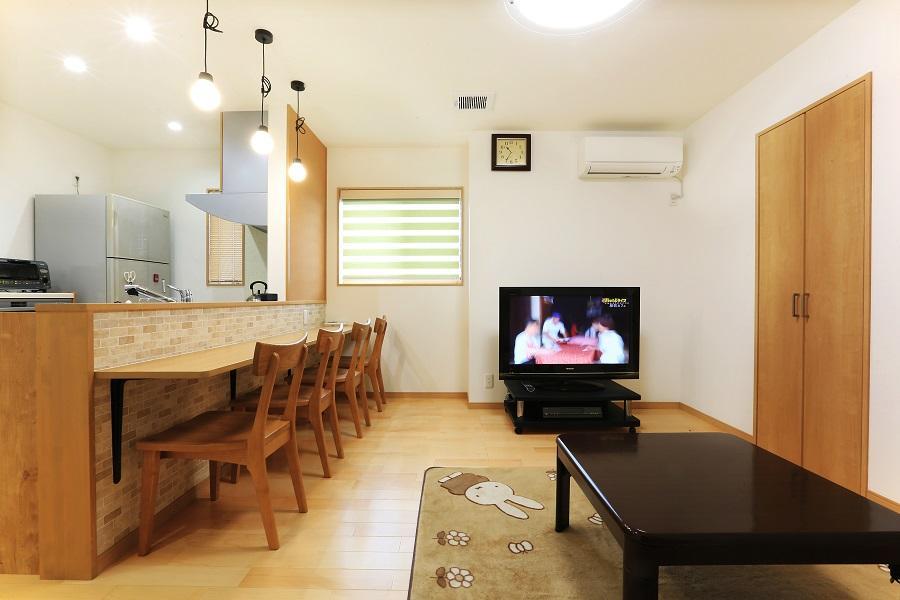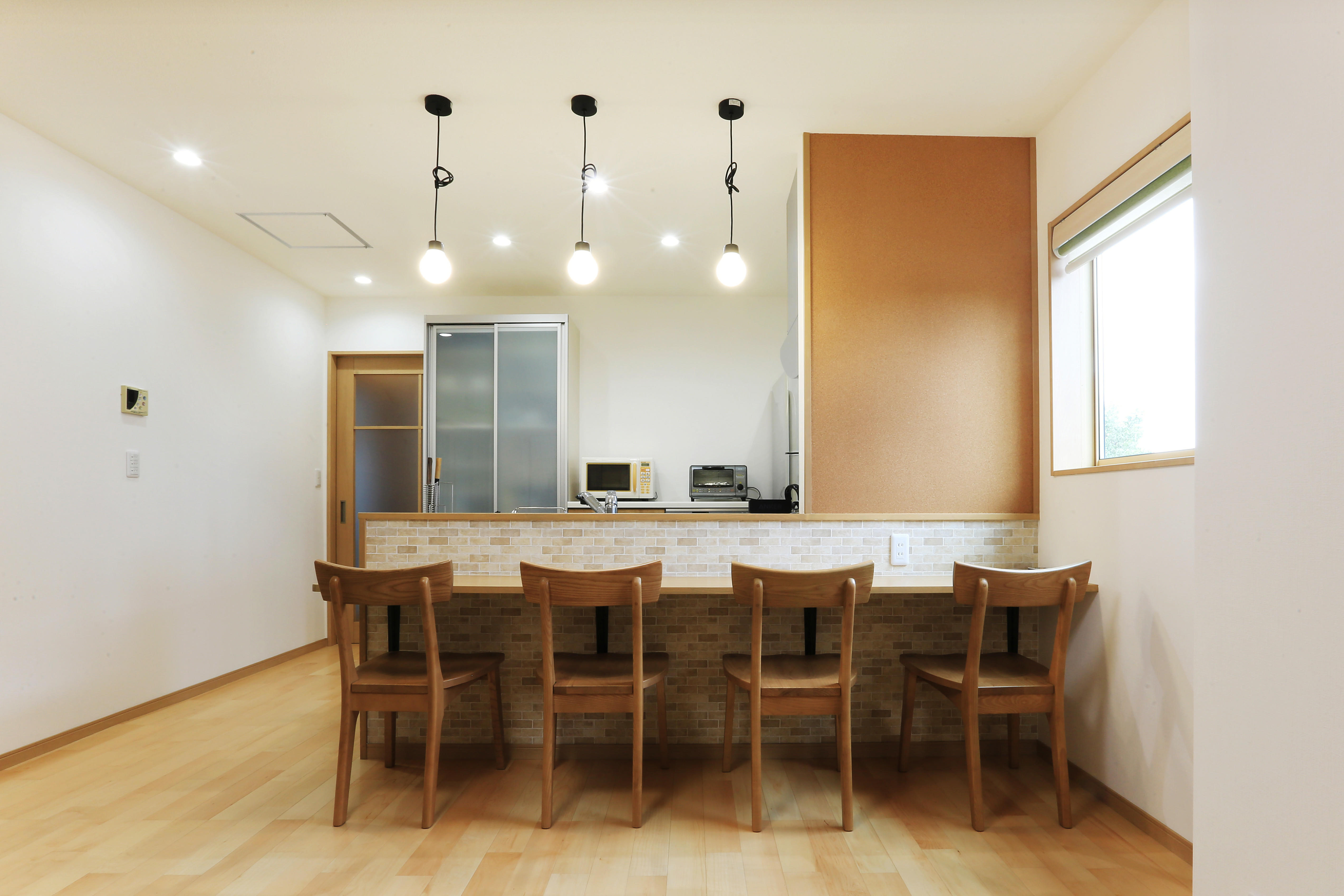 キッチンカウンターは建具と同色のペールカラーで一体感を。カウンター前はブリック調のアクセントクロスでお洒落に仕上げました。ペンダント照明は全方位に明かりが広がるデザインを選択。照明のコードとカウンターを支える金物はブラック系でまとめアクセントにしました。地域の広報や掲示物を貼る場所が欲しい!とのご要望については、カウンター前右側の壁をコルク仕上げとし掲示コーナーに◎