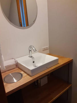 元大工の経験を活かし、ペーパーホルダーを造作にし手すりを兼用で造作しました。結果トイレ内の雰囲気が柔らかい感じに仕上がりました。 また、手すり部分は携帯置きとしても活用いただけます。