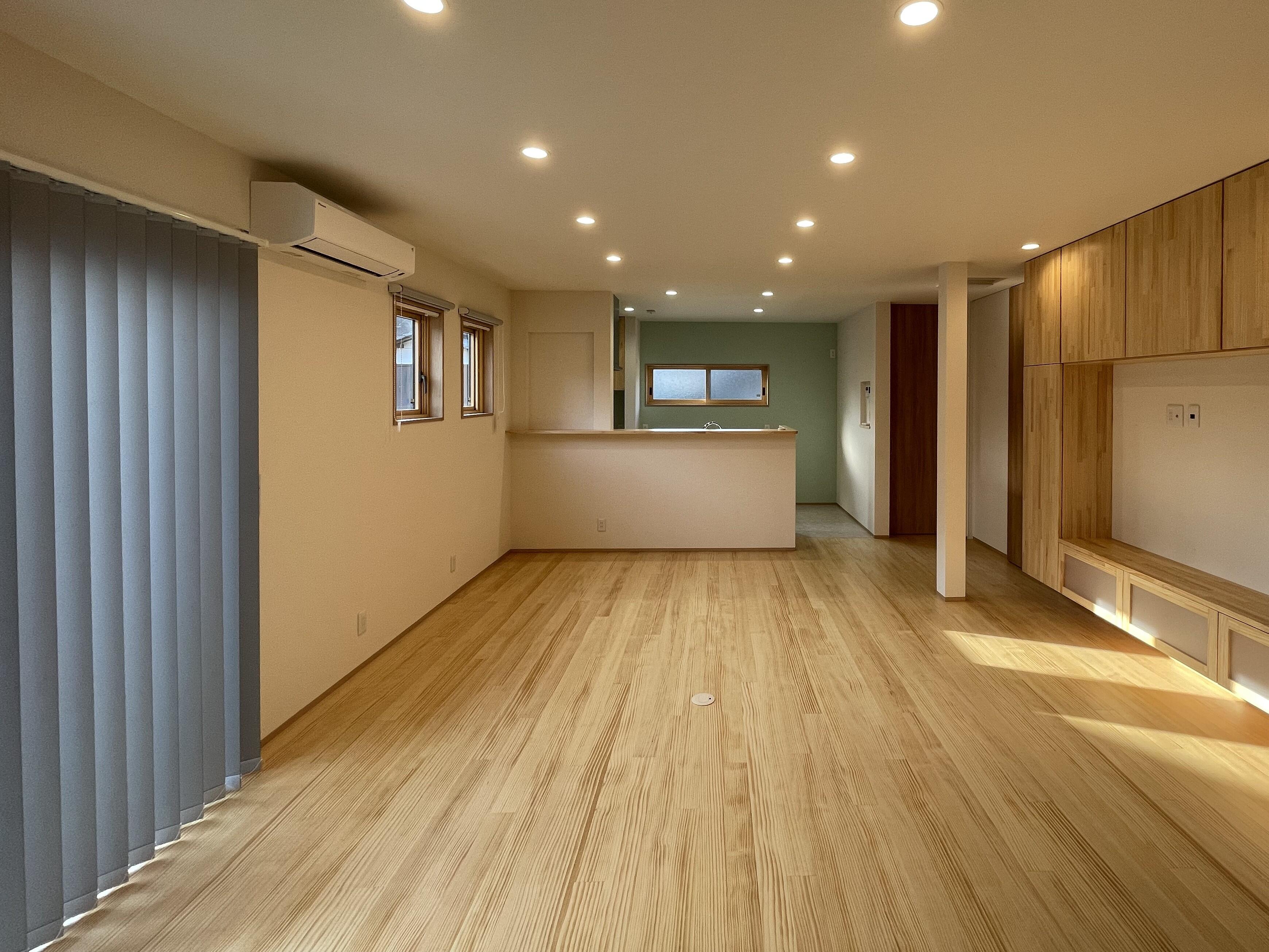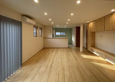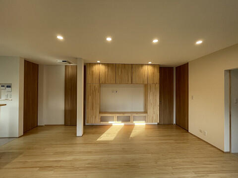 壁一面に設けられた木製の収納棚は、床と同素材で作成し雰囲気を統一、実用性も兼ね備えています。テレビボードとして活用でき、部屋をすっきりと保つのに役立ちます。