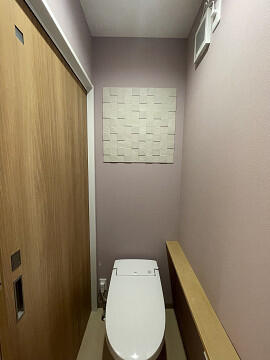 明るい木目のフローリングと、壁面の木材が温かみのあるナチュラルな雰囲気を演出しています。全体的にアースカラーでまとめられているため、落ち着いた印象に仕上がりました。