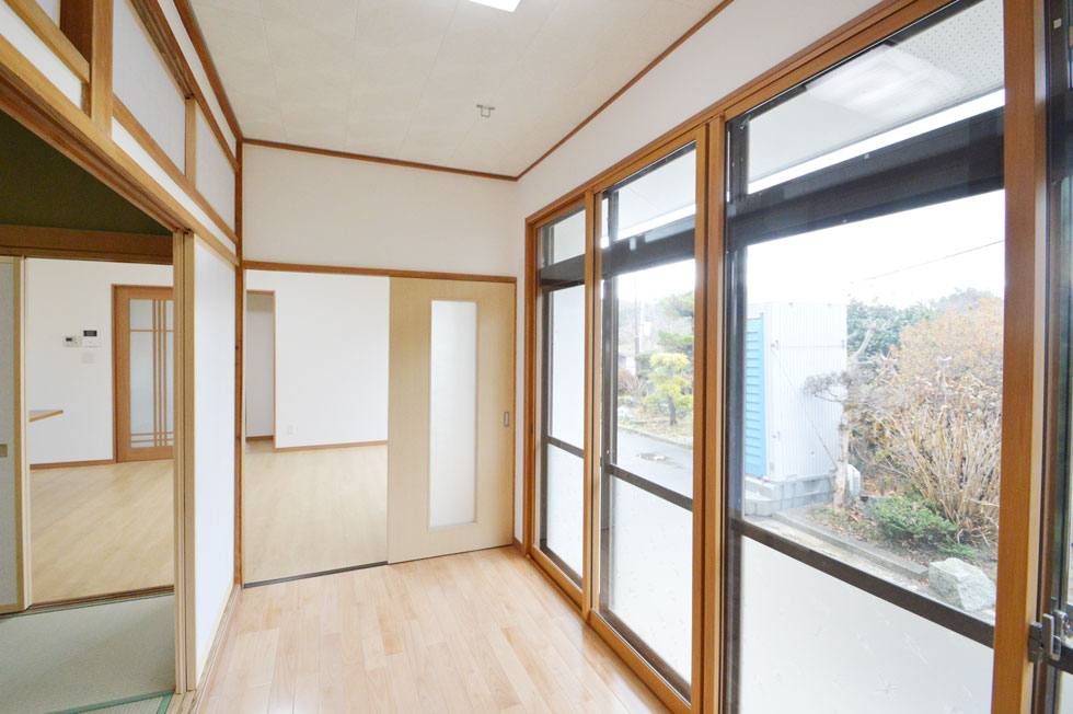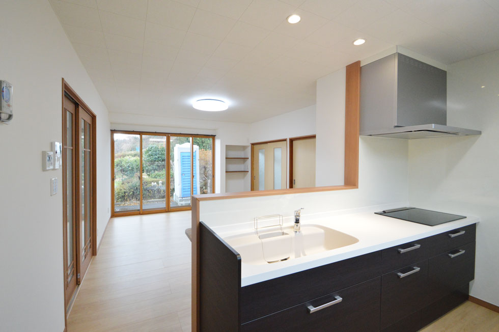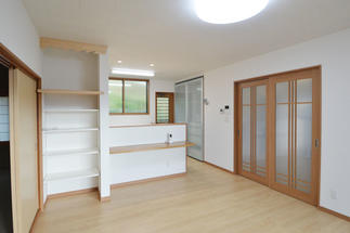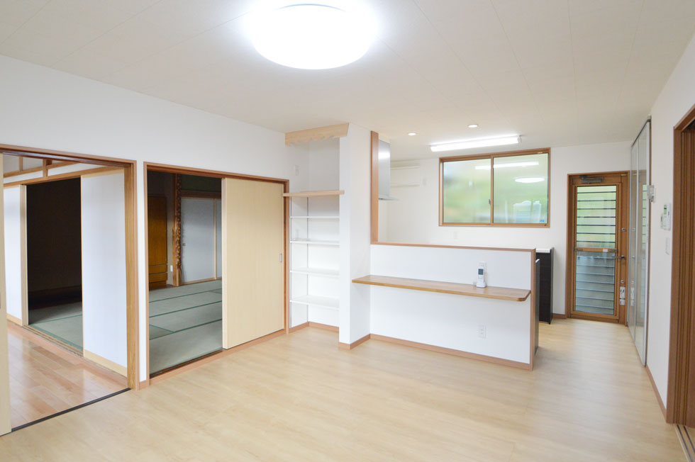狭い台所と茶の間とに間仕切りで仕切られていたので、間仕切りを取り払い、LDKスタイルに変更することをご提案。家事をしながら家族とのコミュニケーションが図れ、小学生のお子さまがいる娘さんご家族にピッタリの間取りです。また、壁や天井に断熱材が入っていなかったので、冬場、暖かく過ごせるように断熱改修も併せて、ご提案させていただきました。