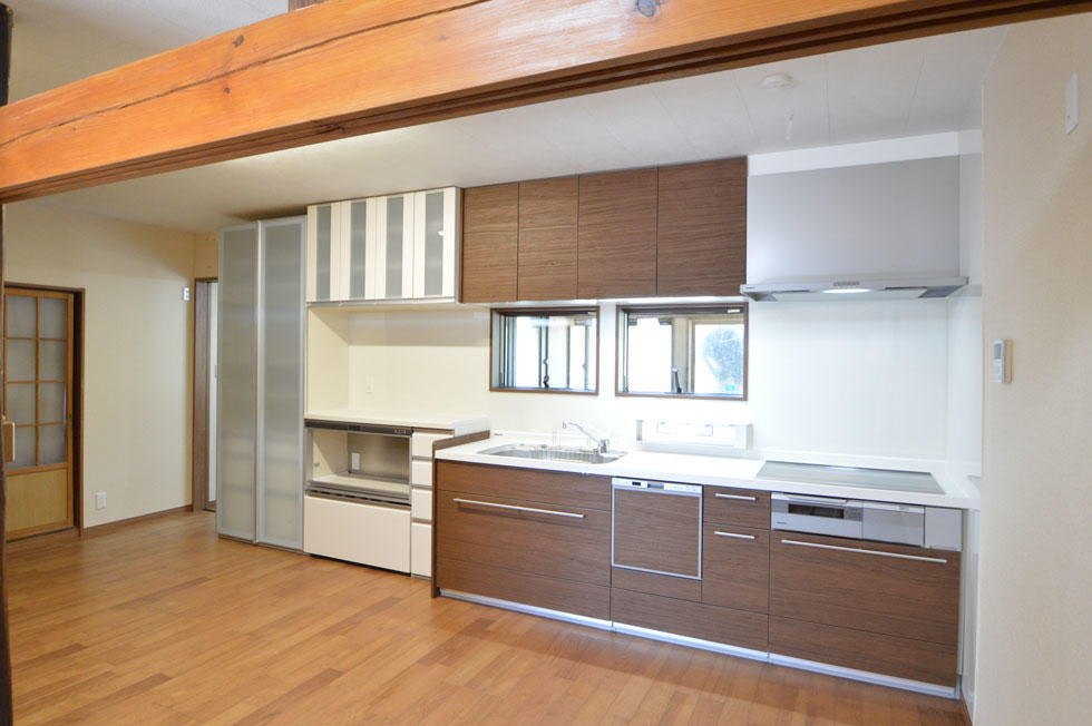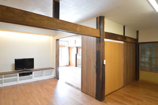 お施主との出会いは、リクシルのショールームで開催されたリフォーム相談会に参加したことです。 水廻りもだいぶ老朽化しておりましたし、母の部屋が北側でジメジメと湿気がひどく、押入れがカビでしまっていたことがきっかけでした。 台所も使いにくく、だいぶすすけていたので、新しくしたいと思っていたそうです。 フルリフォームをきっかけに、まず、キッチンの土間部分に床を張り、フラットなスペースにしました。 これによって、キッチンの不便さを解消しました。 古い梁や柱をそのまま残しつつ、壁、天井を一新し、明るく快適な部屋となりました。 お母様の部屋を南側の日当たりの良い部屋へ、日中も過ごしやすい部屋に改修をしました。