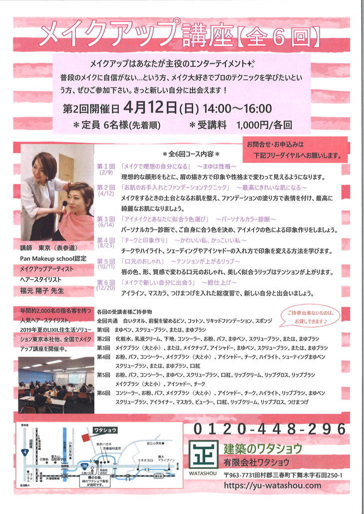 4月は『メイクアップ講座』を開催いたします。