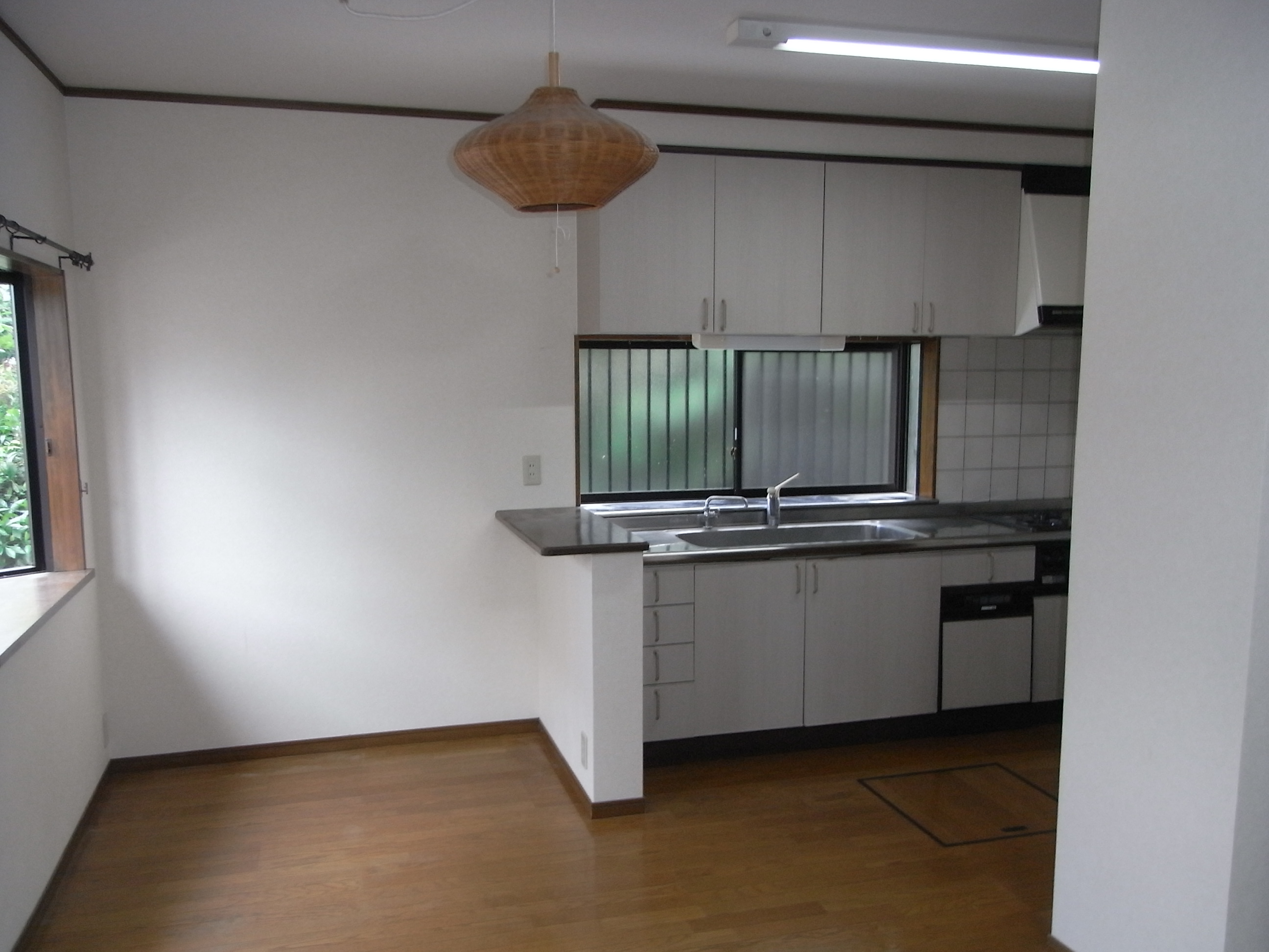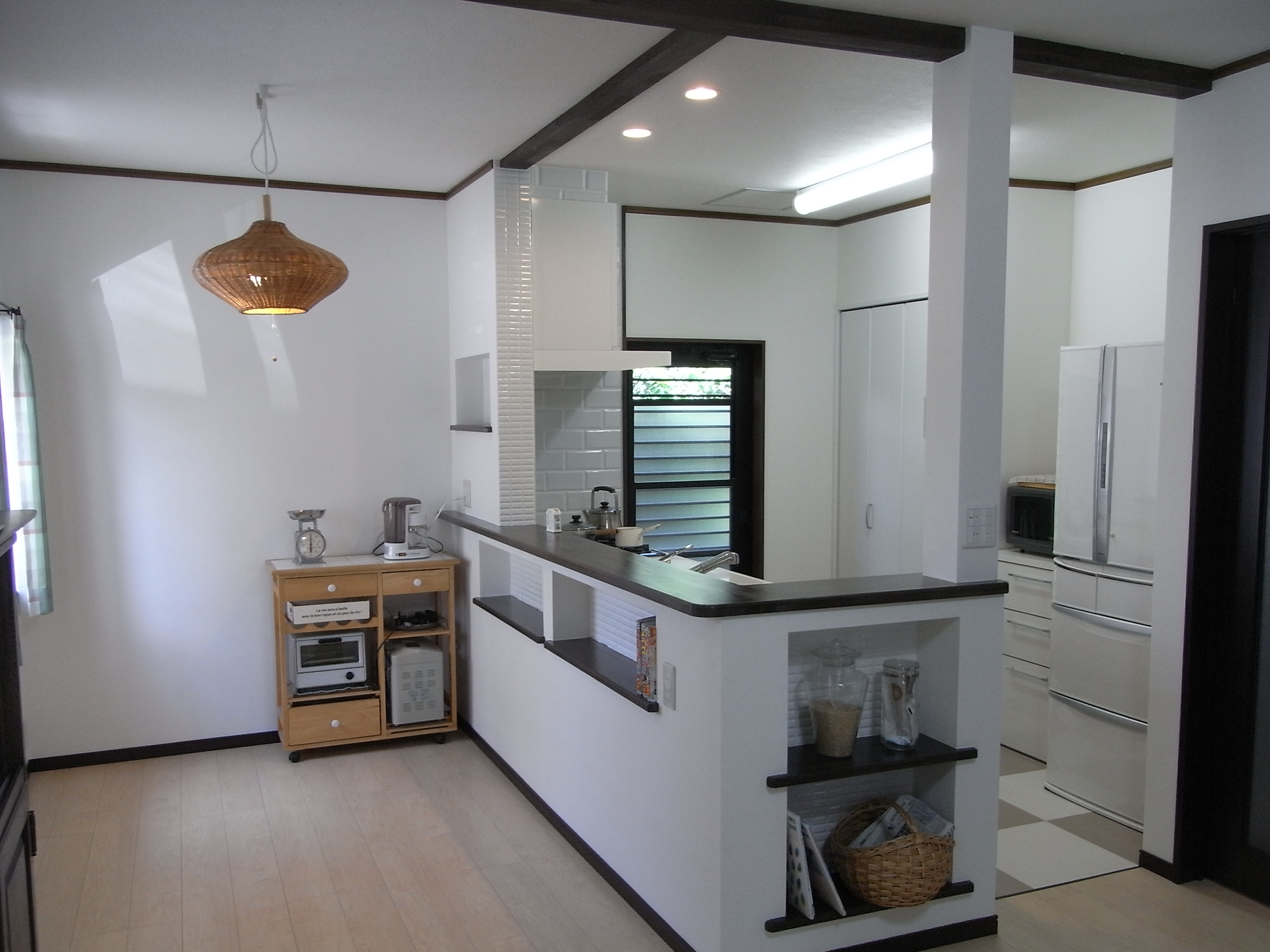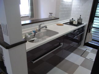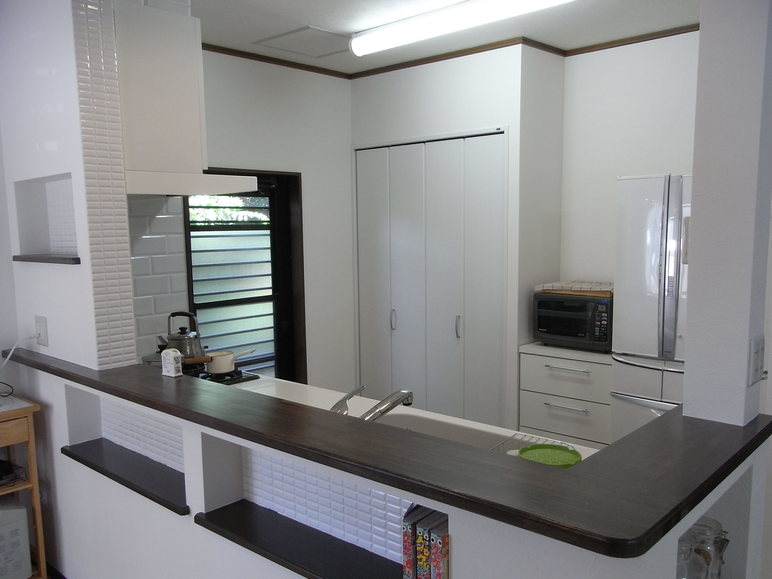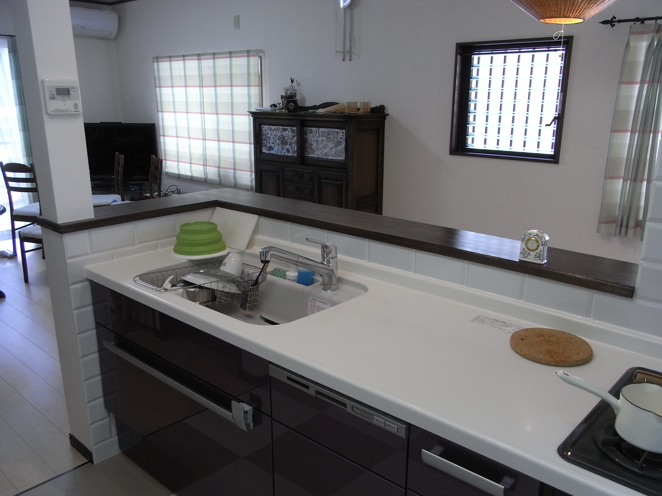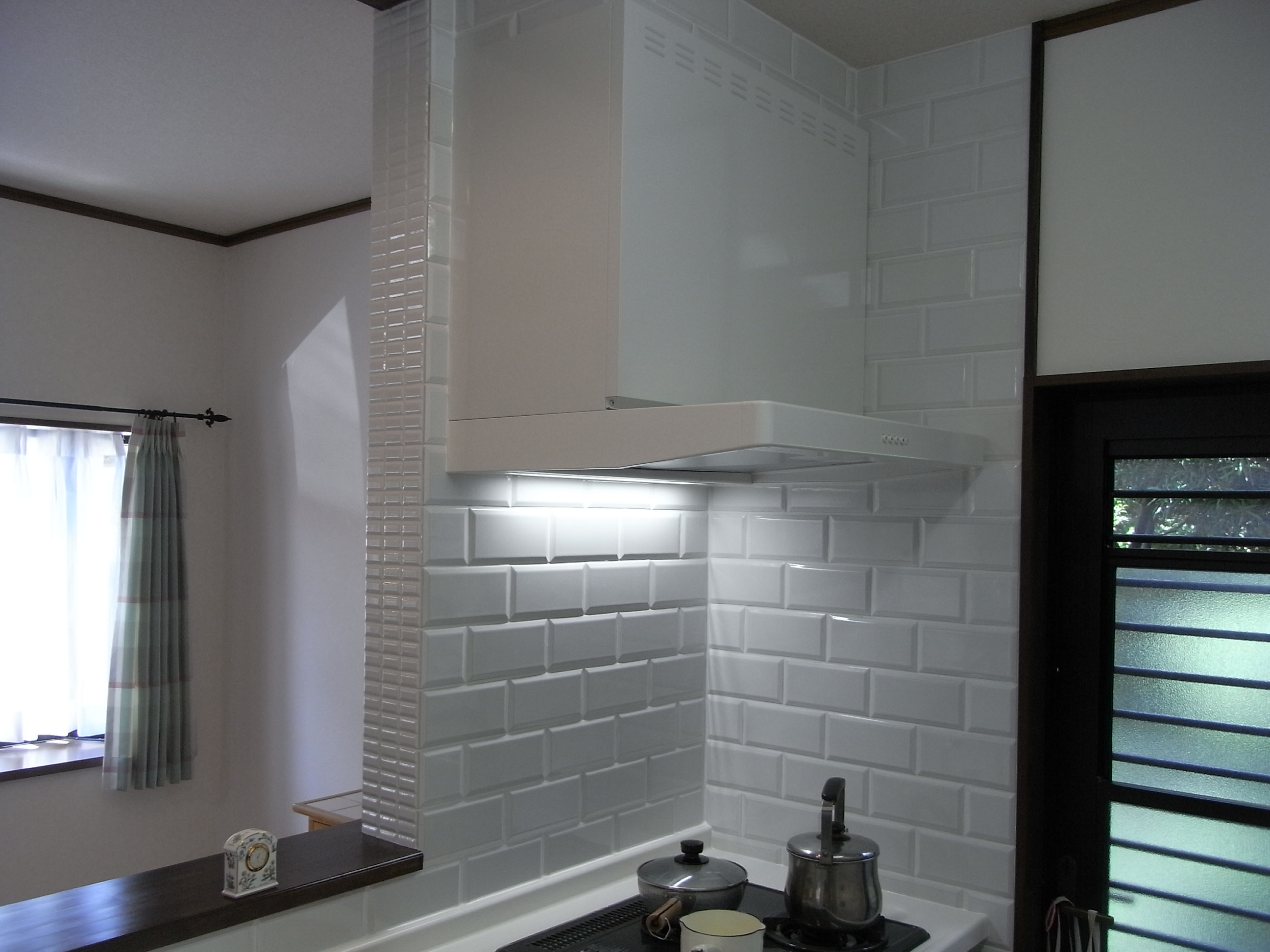 対面キッチンにし、手元が見えないように少し高めのカウンターを付けました。カウンター下にはニッチを設け、本を置いたり、小物を飾ったりできます。ニッチの奥には、レンジフード廻りに貼ったタイルとお揃いのタイルを貼りました。