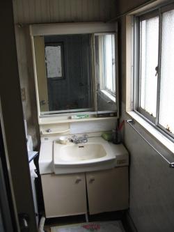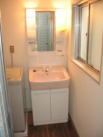 【工事内容】 洗面台取替え ・ 壁天井のクロス張り ・ 窓枠のペンキ塗替え床板腐食部補修 ・ 洗濯機防水パンの取付 ・ 浴室クリ-ニング以上の工事で見違えるように、綺麗になりました。