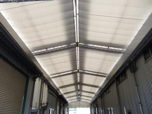 工場の開閉式テントを張り替えました。工場の休業日(土日)に約5mの作業場所をローリングタワーで安全に作業しました。