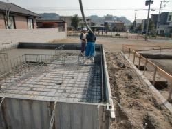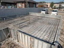 先ず土工事で床掘りした後、防湿ビニールを敷いて捨てコンを打ってその上に、鉄筋を組みます。