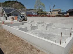 コンクリートを密実に打つ為、バイブレーターを掛けたり、タンピングを行なったり致します。その後、べた基礎完成です。(③)