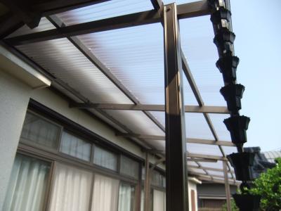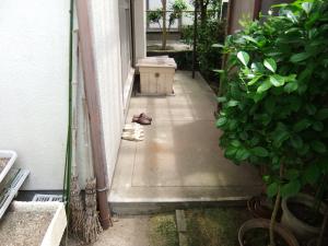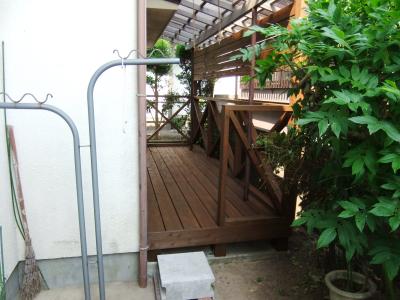 ●お隣との間のテラスにデッキを取り付け、お隣の窓部分には、目隠しの板を張りました。他にも、外壁の修繕、シッャターボックスの取替え、波板の張替えを行いました。