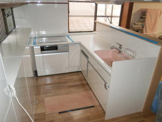 キッチン改修:LIXILシステムキッチン リシェル L型 1部壁キッチンパネル張り 壁天井クロス張り