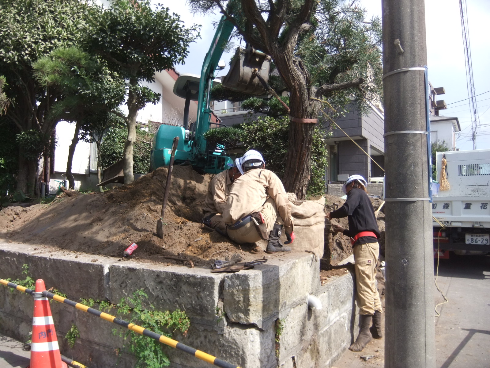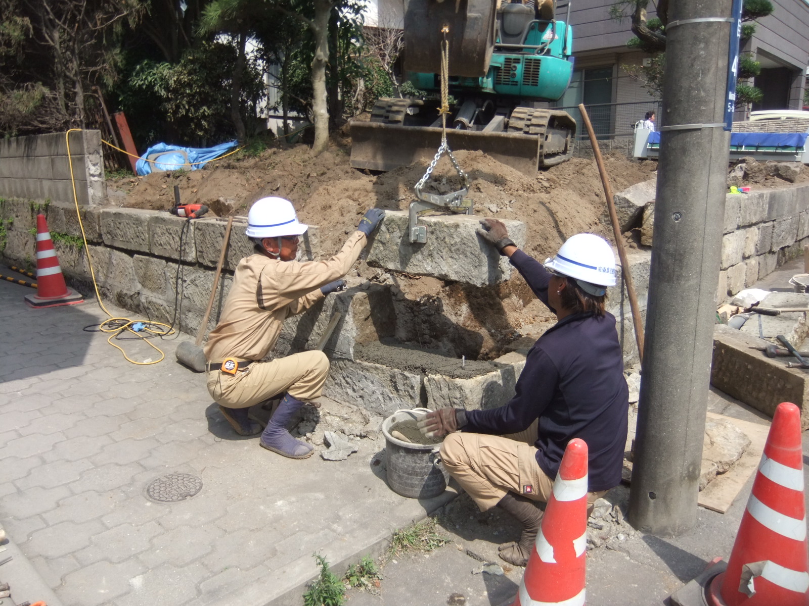 庭木の根で石垣がズレ、積みなおすことになりました。ついでに駐車スペースの拡張も行いました。