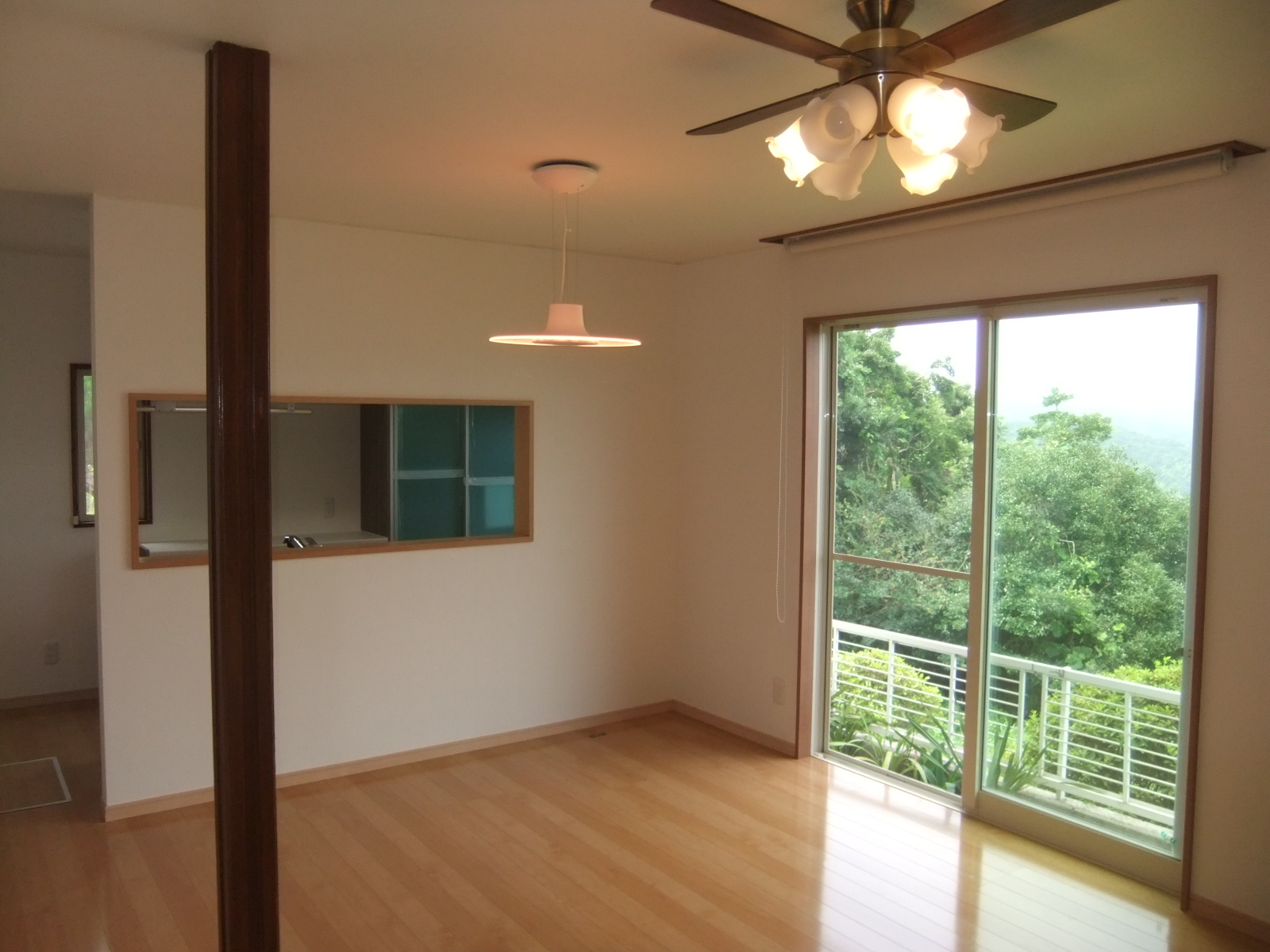 リビングはアルミサッシ取り替え、床フロアの増し張り、壁、天井のクロス張替、照明器具等の取り替え工事をおこないました。アルミサッシがペアガラスになった関係で、防音性が上がったようです。