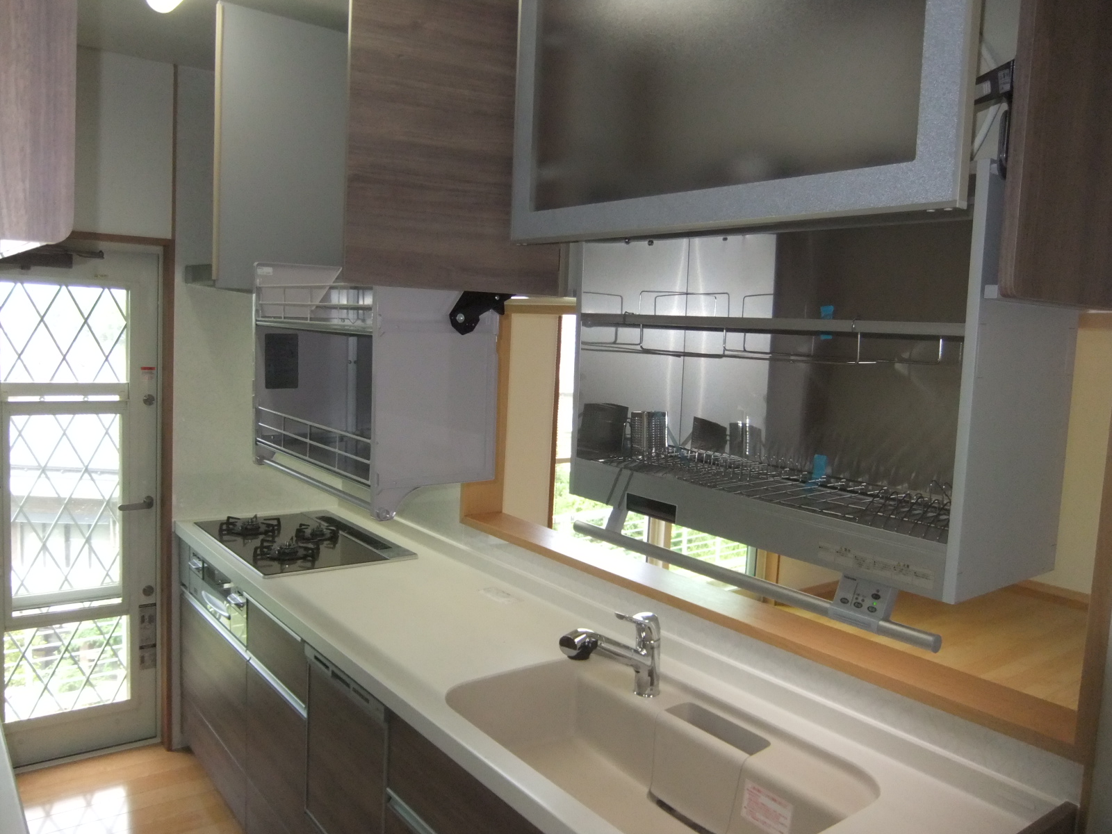 奥様のこだわりのキッチン アレスタ 扉はクオリティウッド ワークトップはマロンベージュで仕上げ、食洗機、オートダウンウォール、ダウンウォールを取り付け小柄の奥様に使い勝手の良いキッチンに仕上がりました。背面にはスライディングドアストッカーにより収納力も抜群です。