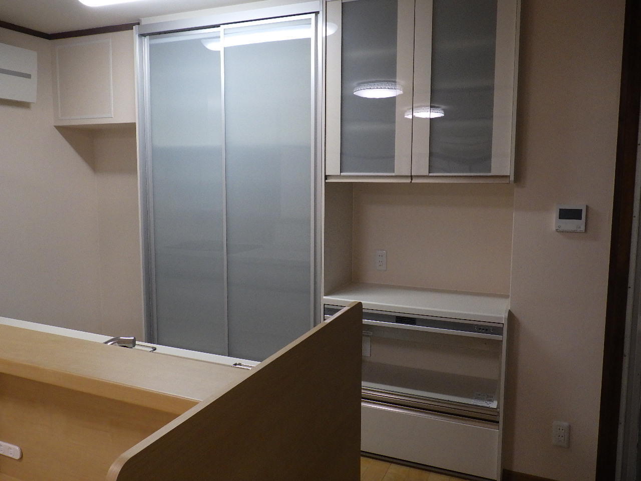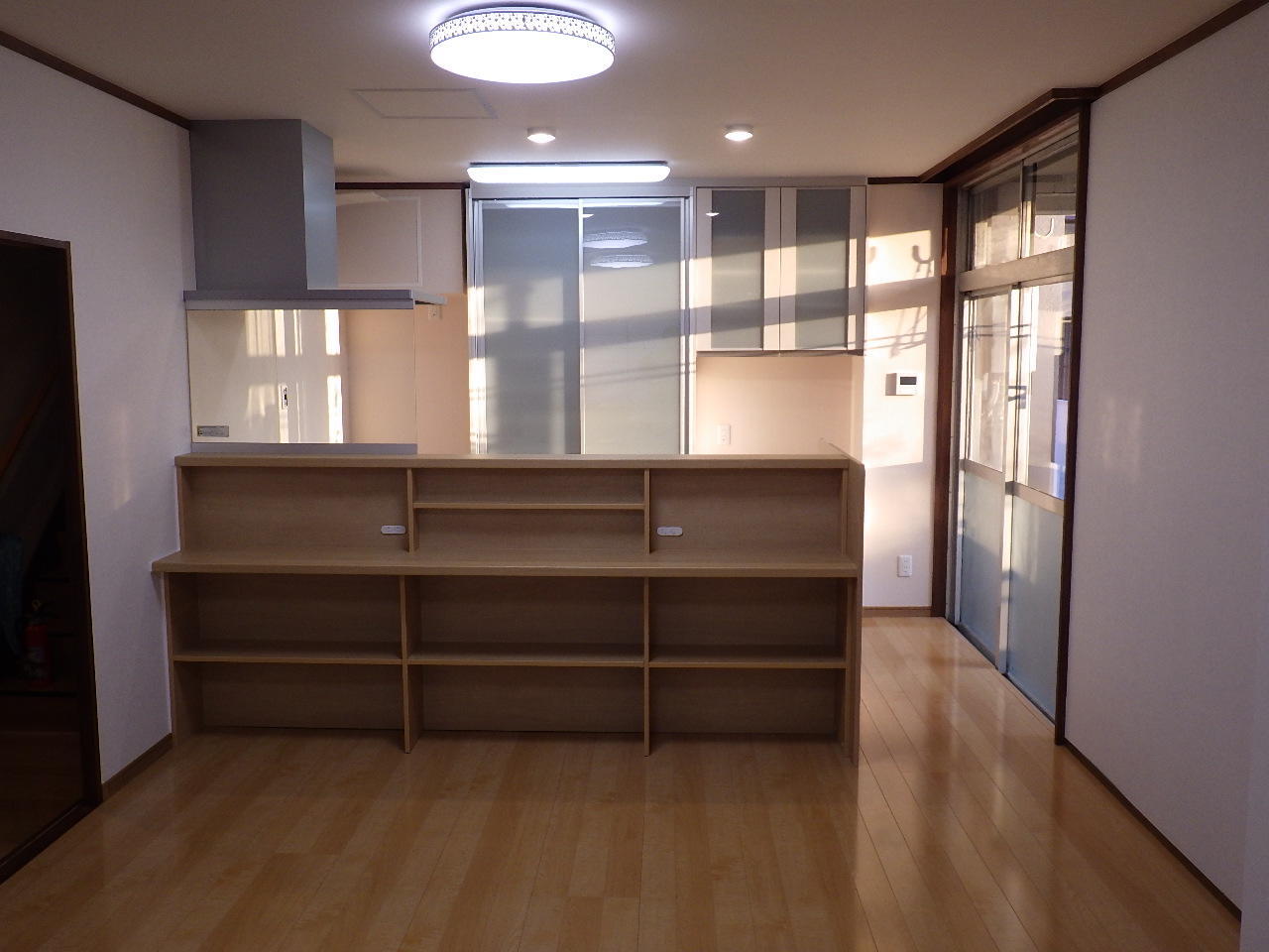 鉄筋3階建ての店舗兼住宅の1階部分の店舗、台所、浴室、洗面所とトイレをリフォームしました。今回は台所、リビングのご紹介です。キチンはアレスタ〈17〉255cm/65cm/85cmの大きさで、トップは人造大理石。ガスコンロ3口で食器洗い乾燥機付きとレンジフードには過熱器連動付きですのでガスを付けるとレンジが勝手に排煙してくれる優れものです。また、対面キッチンユニットはクリアペールで仕上げ部屋全体の統一感を持たせました。工事期間は台所、リビングで約2週間工事金額は、約2,500,000円くらいです。