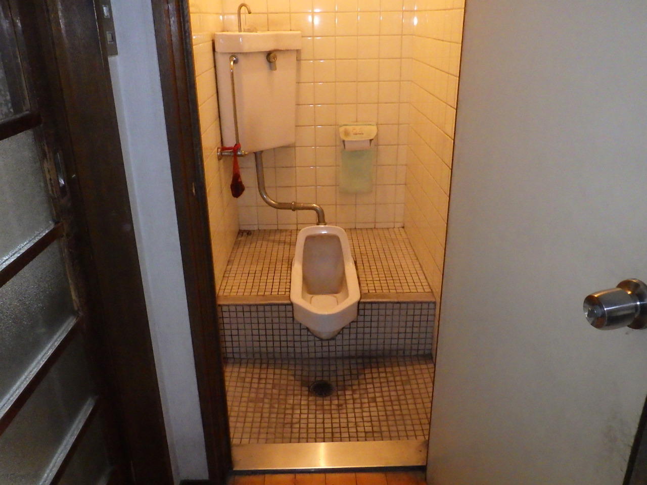 鉄筋3階建ての店舗兼住宅の1階部分の店舗、台所、浴室、洗面所とトイレをリフォームしました。トイレの紹介です。改修前のトイレは兼用便器で出入り口で3cmと30cmの段差がありました。壁は75タイルで、まさに昭和のトイレ。タイルの上に直接サニタリーパネルを張り、今はやりの快適なトイレに変身しました。