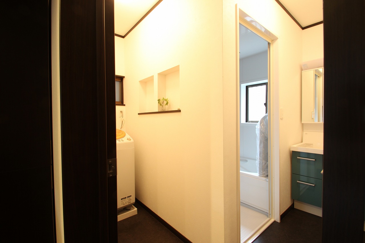 L型にする事で、洗面と洗濯機のそれぞれの空間が確立されました。