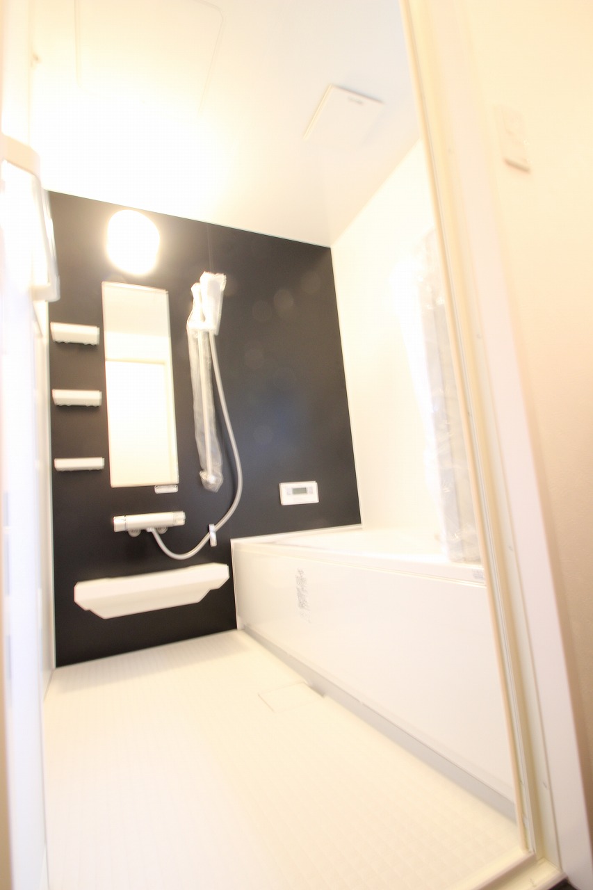 正面一面がダークな色で引き締めつつ、清潔感のある浴室です。