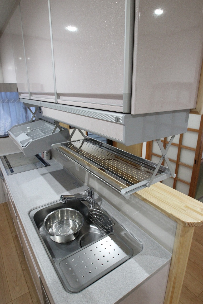 キャビネットには、電動で降りてくる水切りや、小物入れもついています。