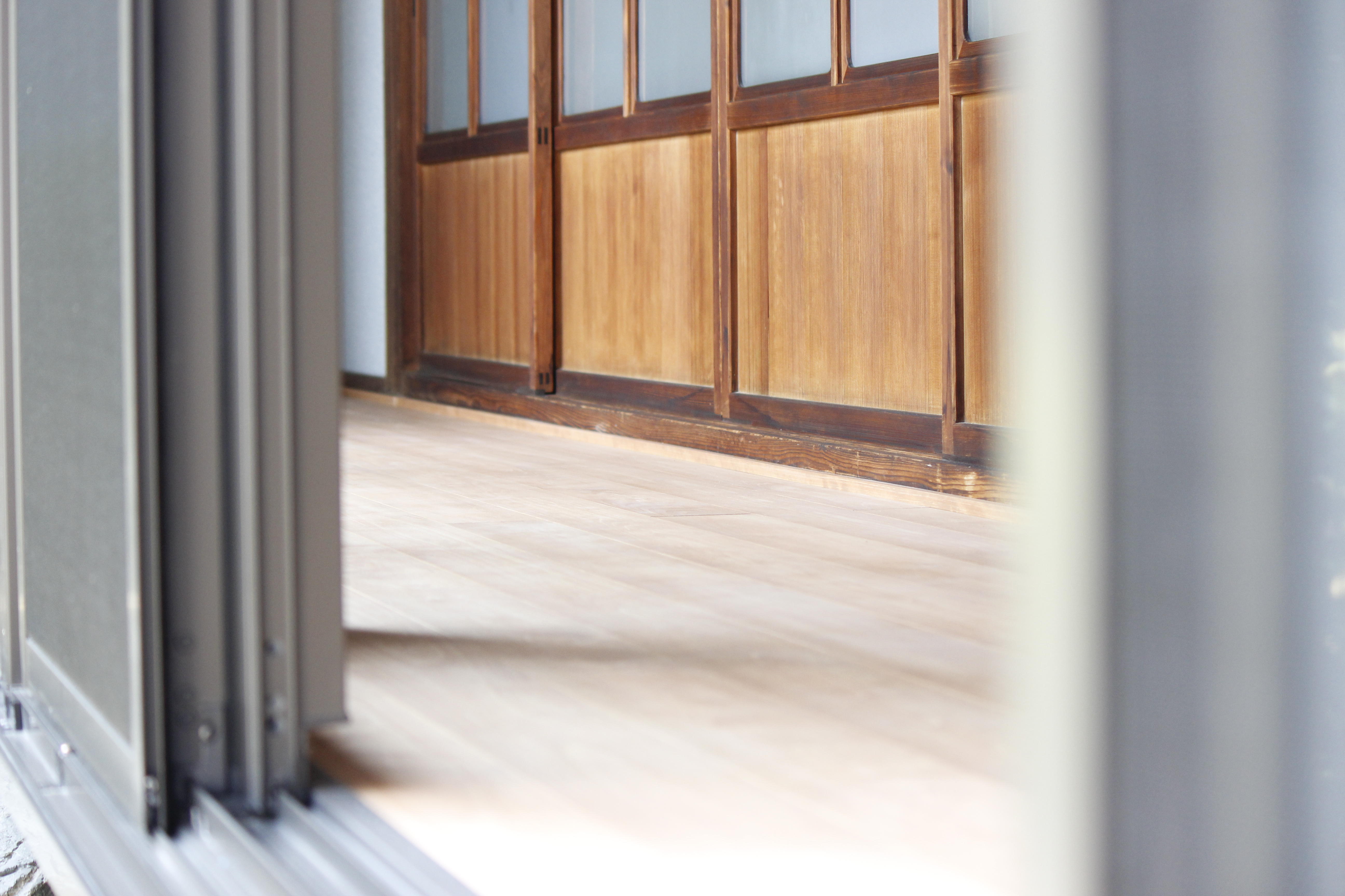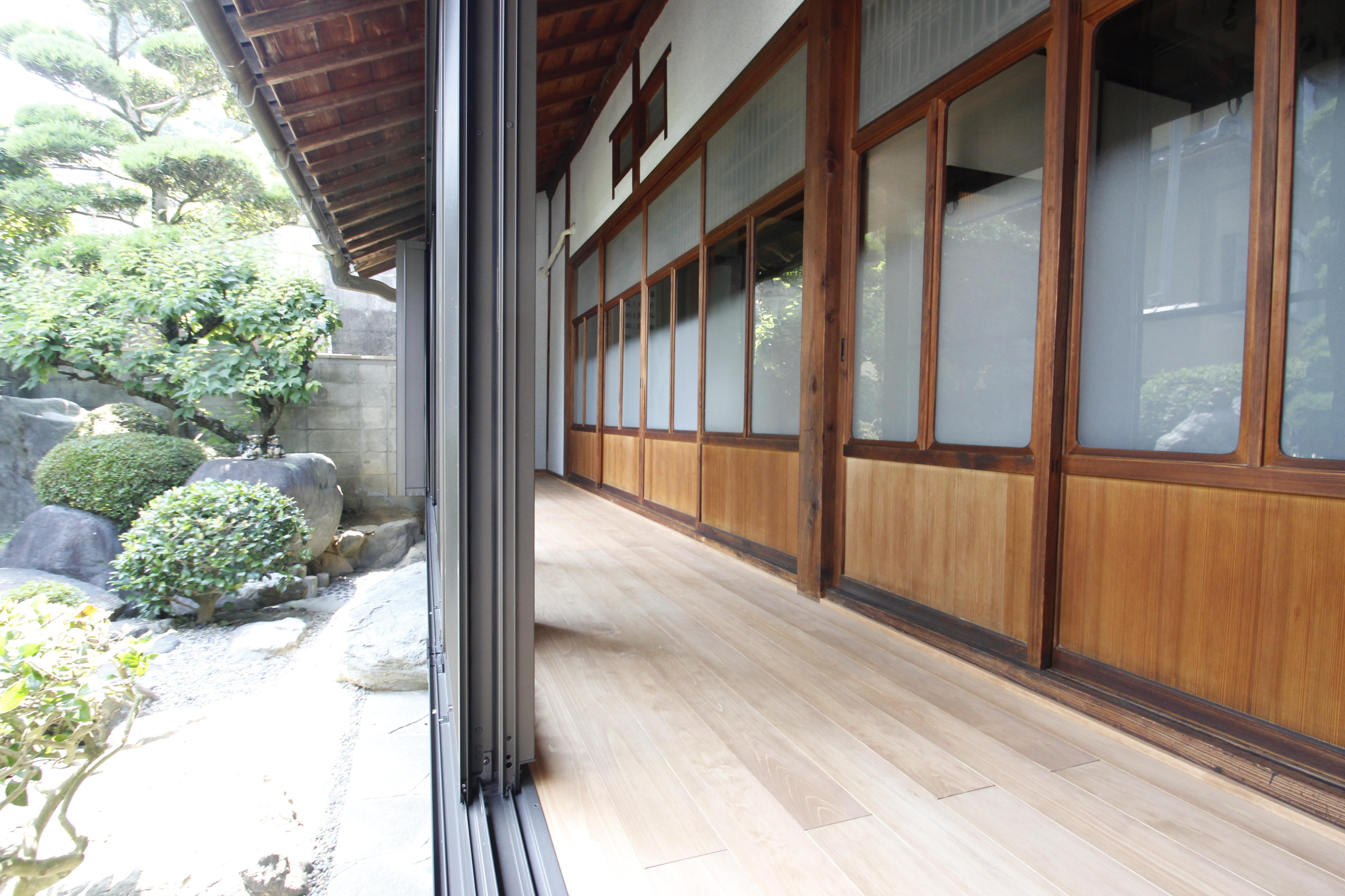 以前の木製の雨戸では、ここ最近の雨風で音が鳴り響き不安に思っていました。縁側部分の幅を少し伸ばし、軒下に枠をつけて窓を設置。雨戸も木製からアルミ製のものになり、開け閉めも軽くて丈夫になりました。