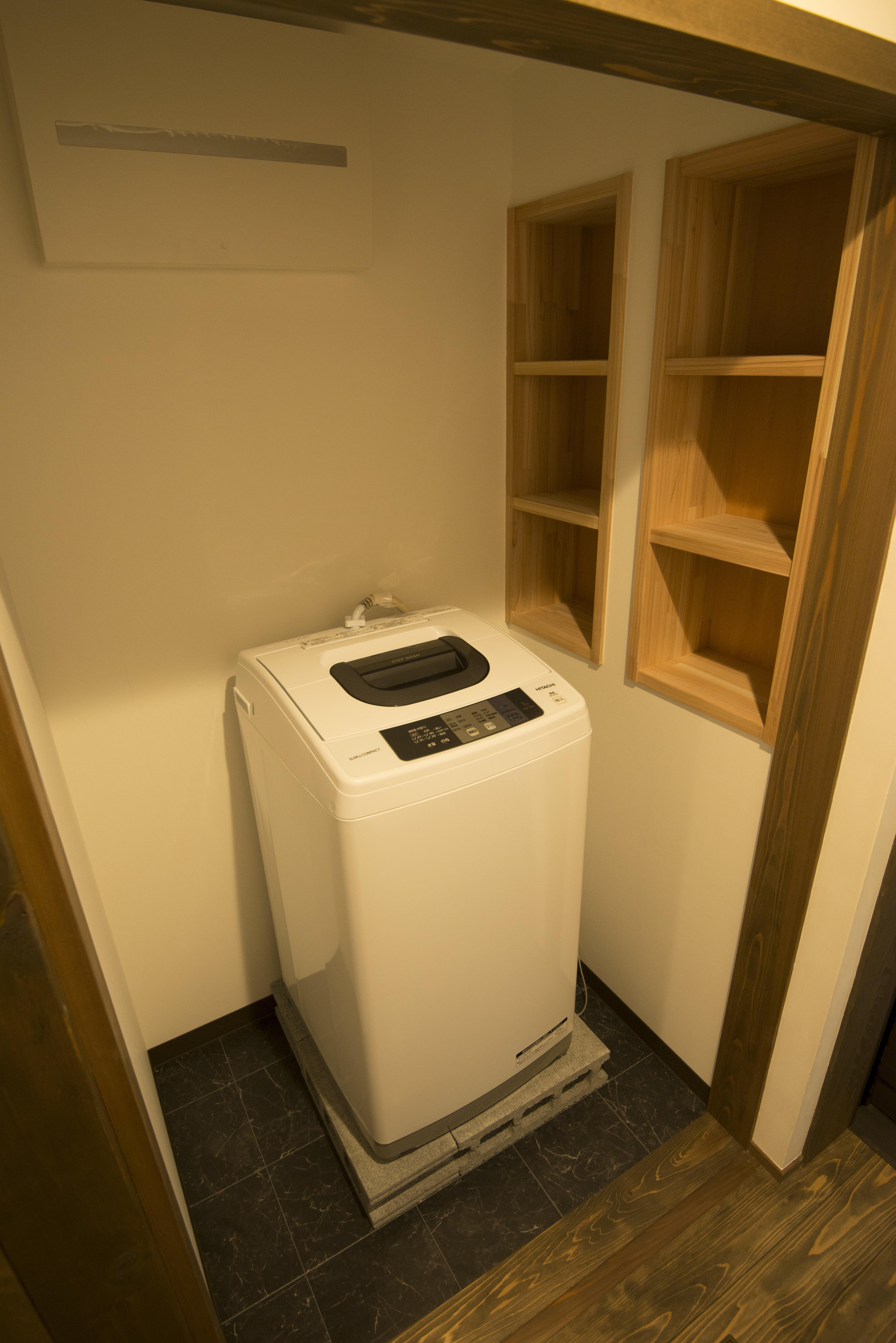 大きな窓を取り開放的な洗面室、洗濯機も収納