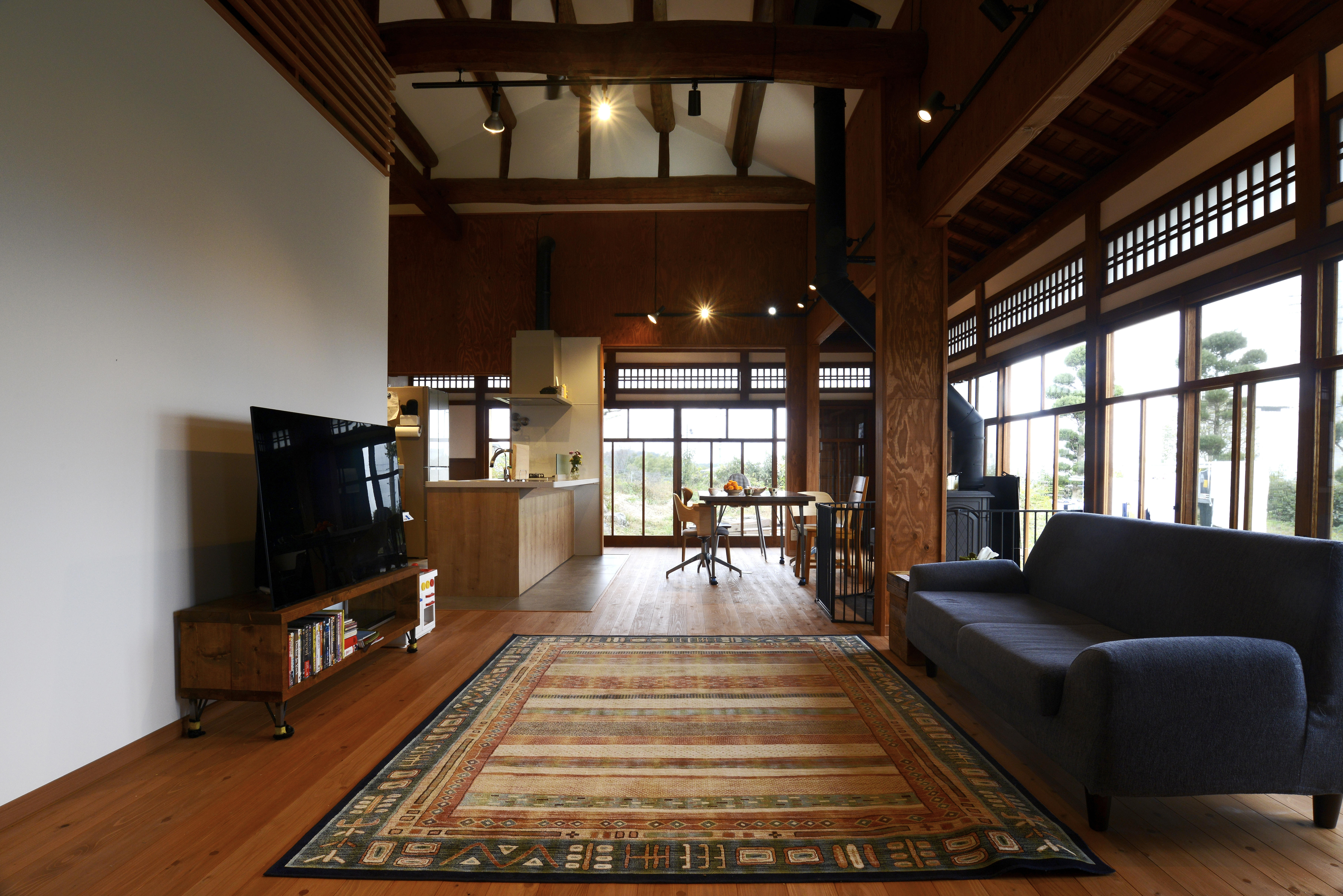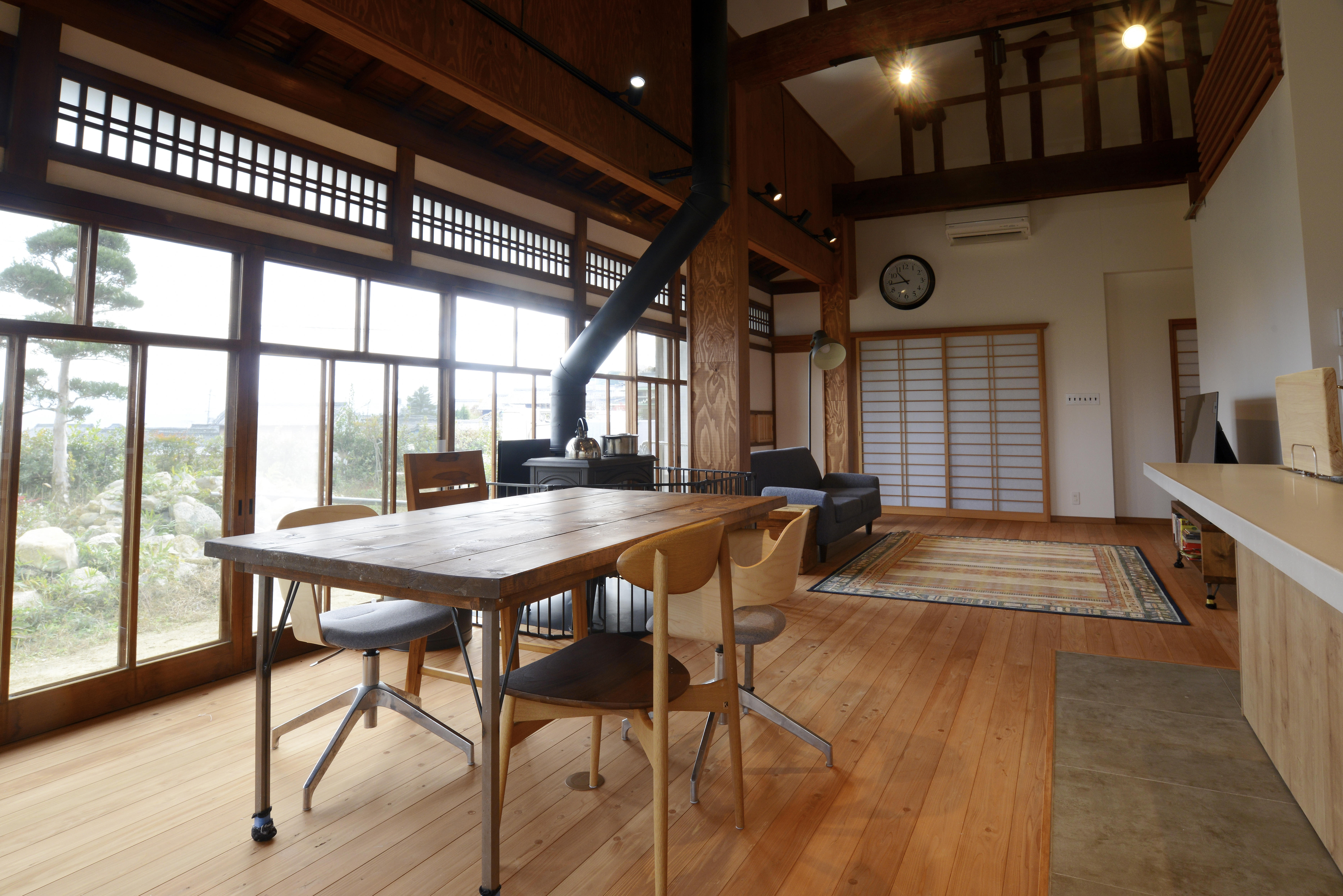 大空間のリビングは昼間は明るく開放的です。こだわりの暖炉とご主人作のダイニングテーブルを設置。天井の高さを利用してロフトを作りました。