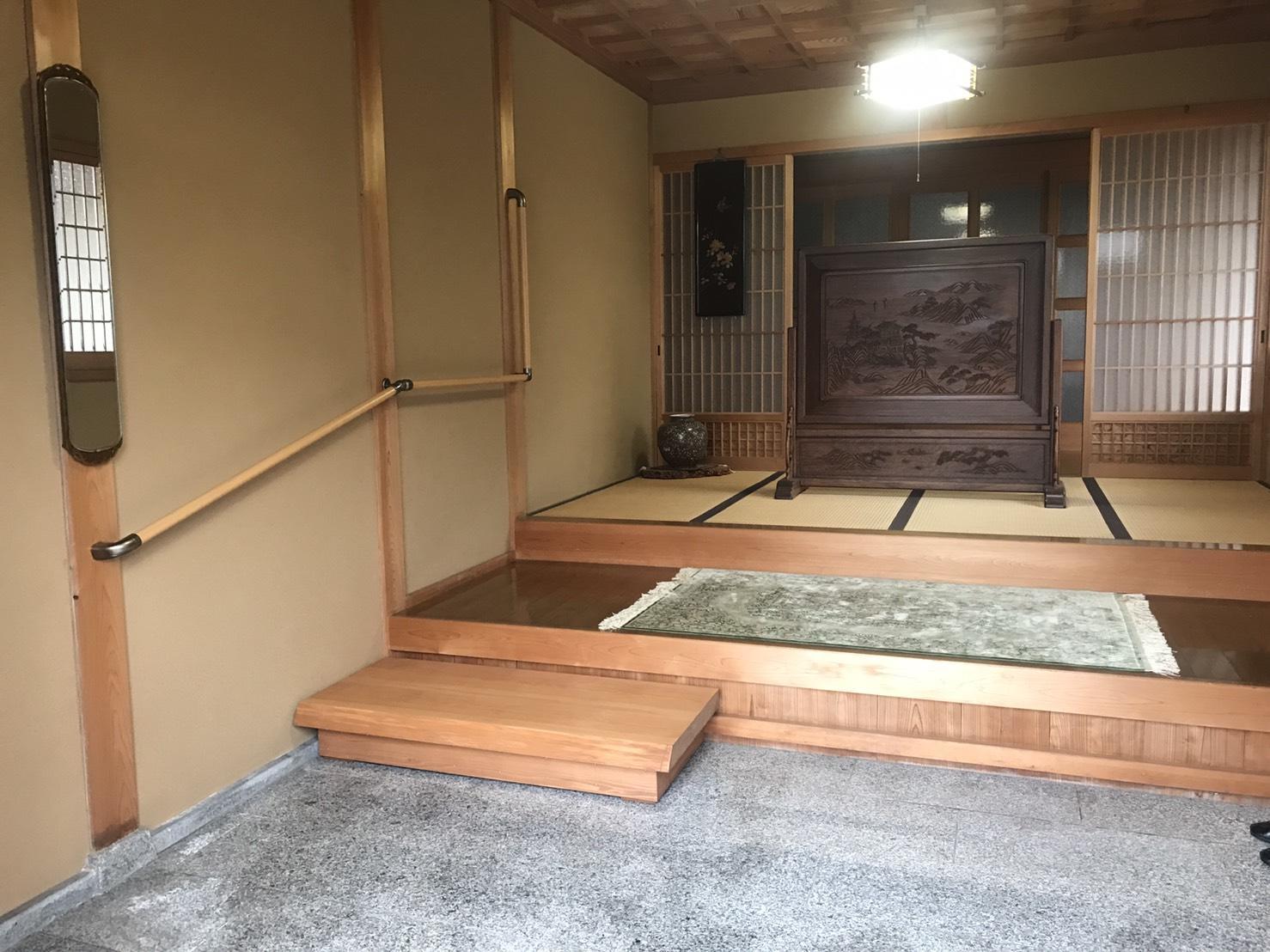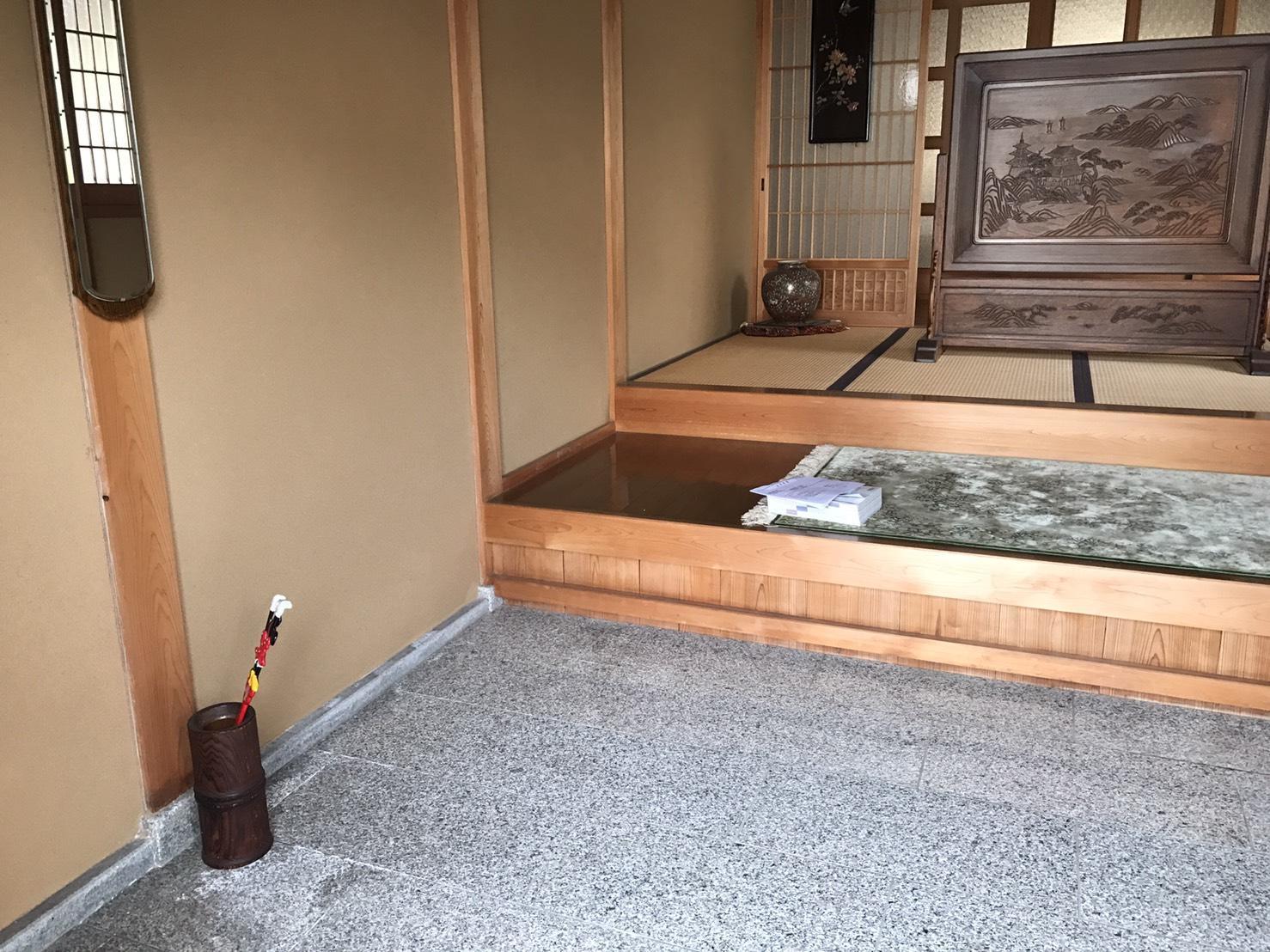 よく手入れされた、木の温もりを感じる玄関。今までは気にならなかった段差が危ないと感じるようになったとのことで大工さんが手仕事で作ったステップ台。