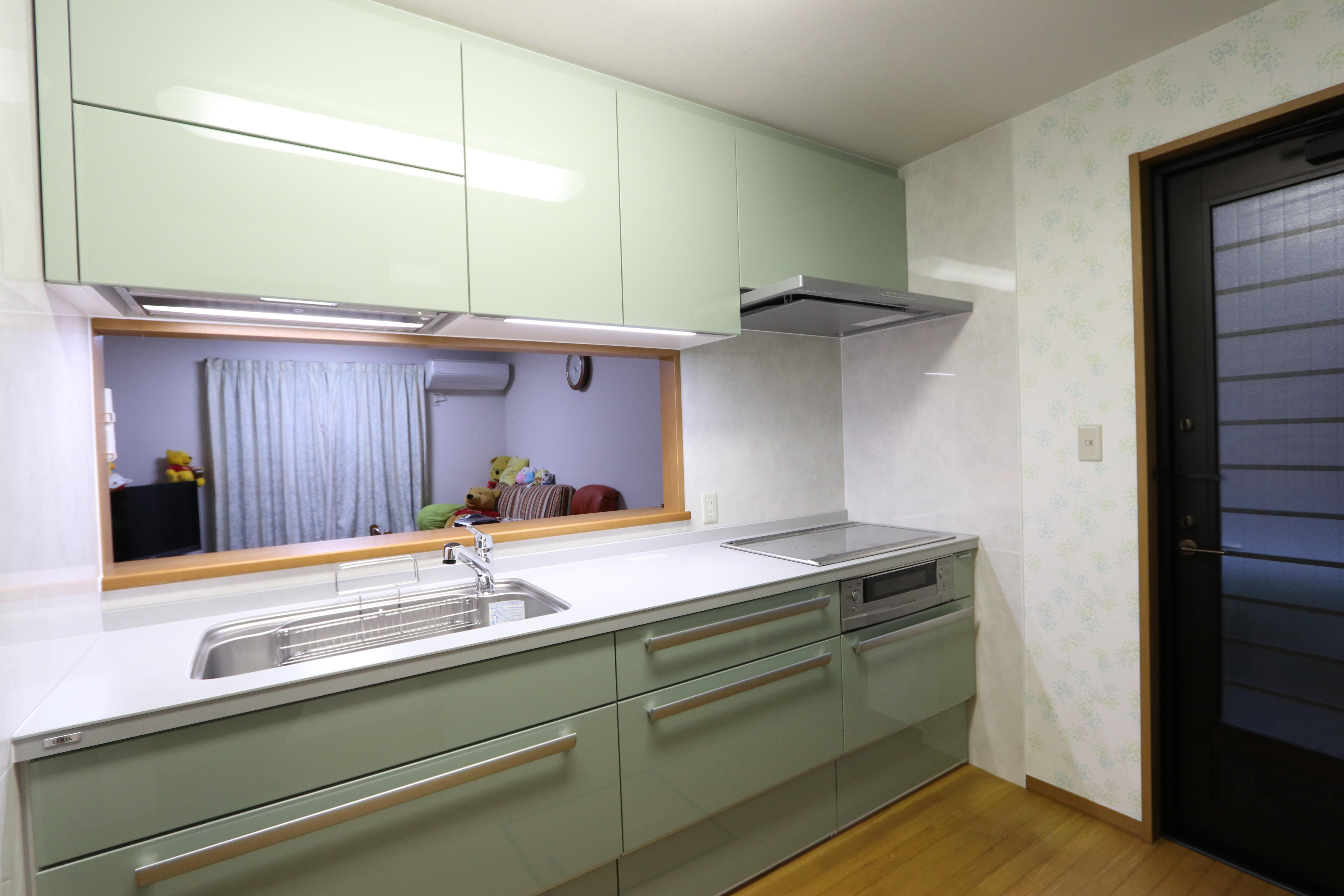 ★お客様がグリーンがお好きで、壁紙も合わせてコーディネートされました!明るく爽やかな空間になって毎日のお料理が楽しくなりそうです♪ ★最新のキッチンはレンジフードなどのお掃除がしやすく、収納の使いやすさも抜群です!キッチン機能アップで忙しい毎日の家事を楽(ラク)にしてみませんか?
