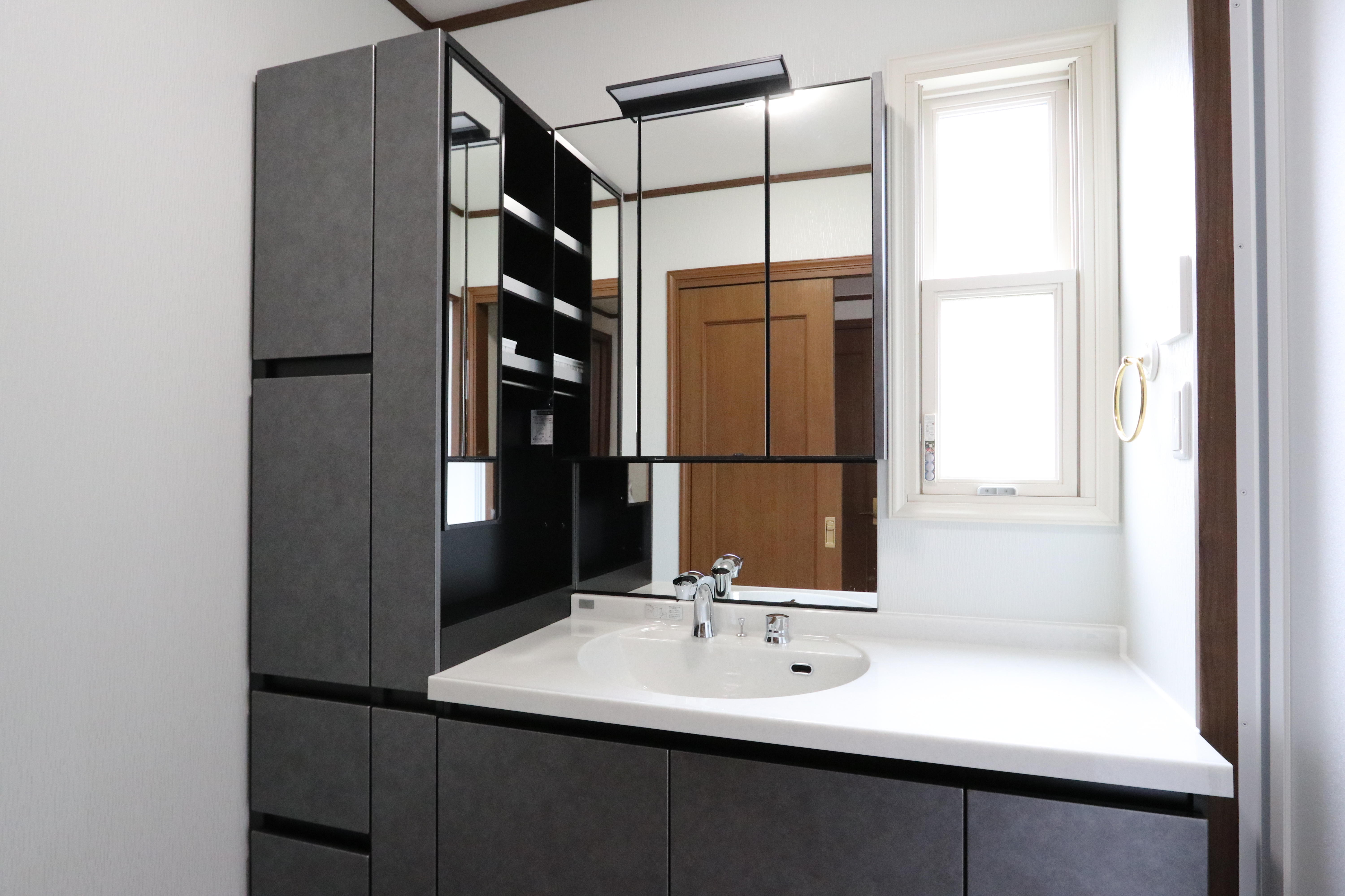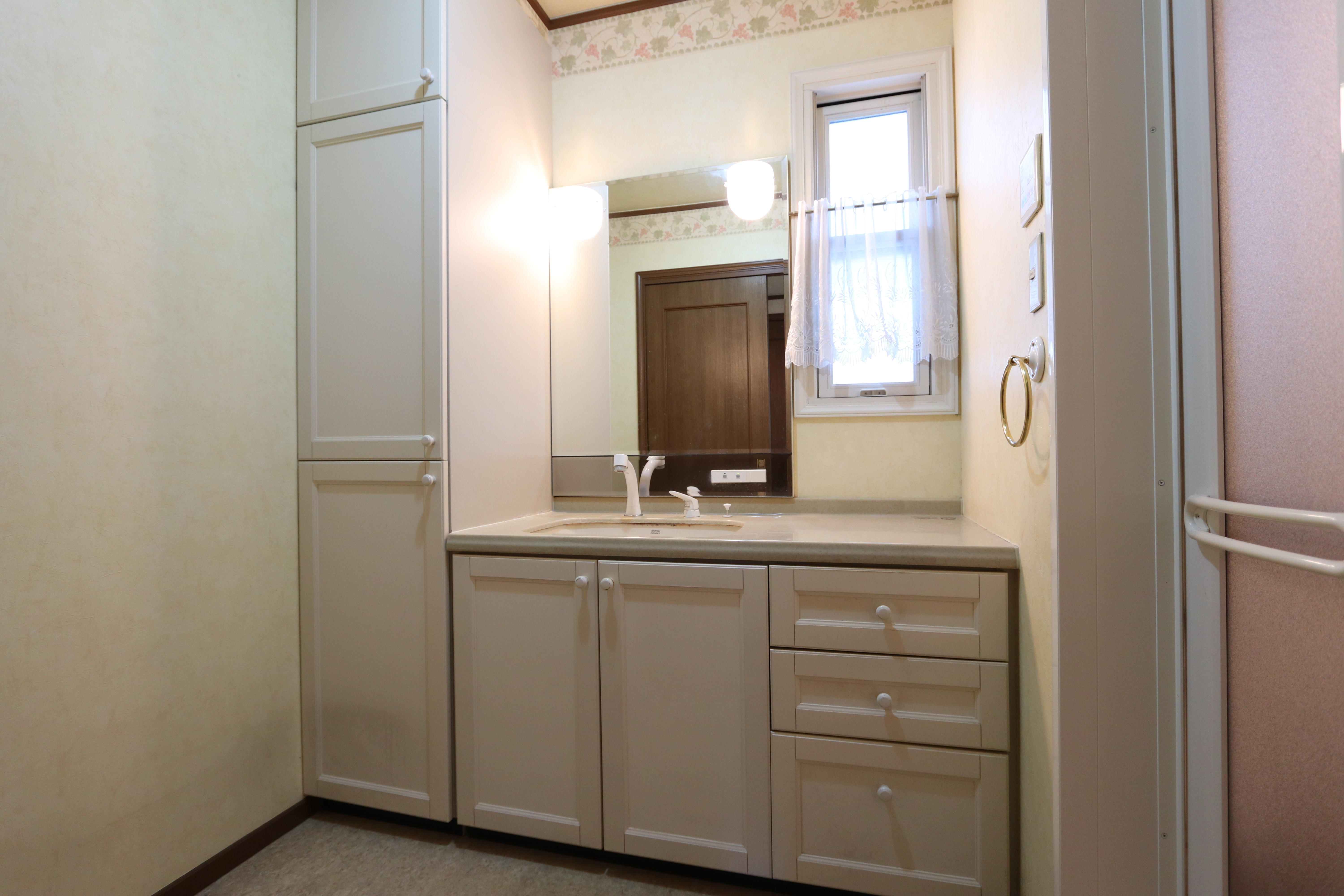 ★収納タイプの洗面化粧台を最新のものに取替えられました。引き出しの数や棚の数も増え、収納の量・使い勝手がぐんとアップしました。★脱衣室に洗面化粧台があると、タオルやヘアメイク道具など家族全員が使うものであふれかえっていませんか?この大容量の引き出し付の洗面台だと、すべてのものがまとめて収納でき、空間がとてもスッキリ見えるのでおすすめです!