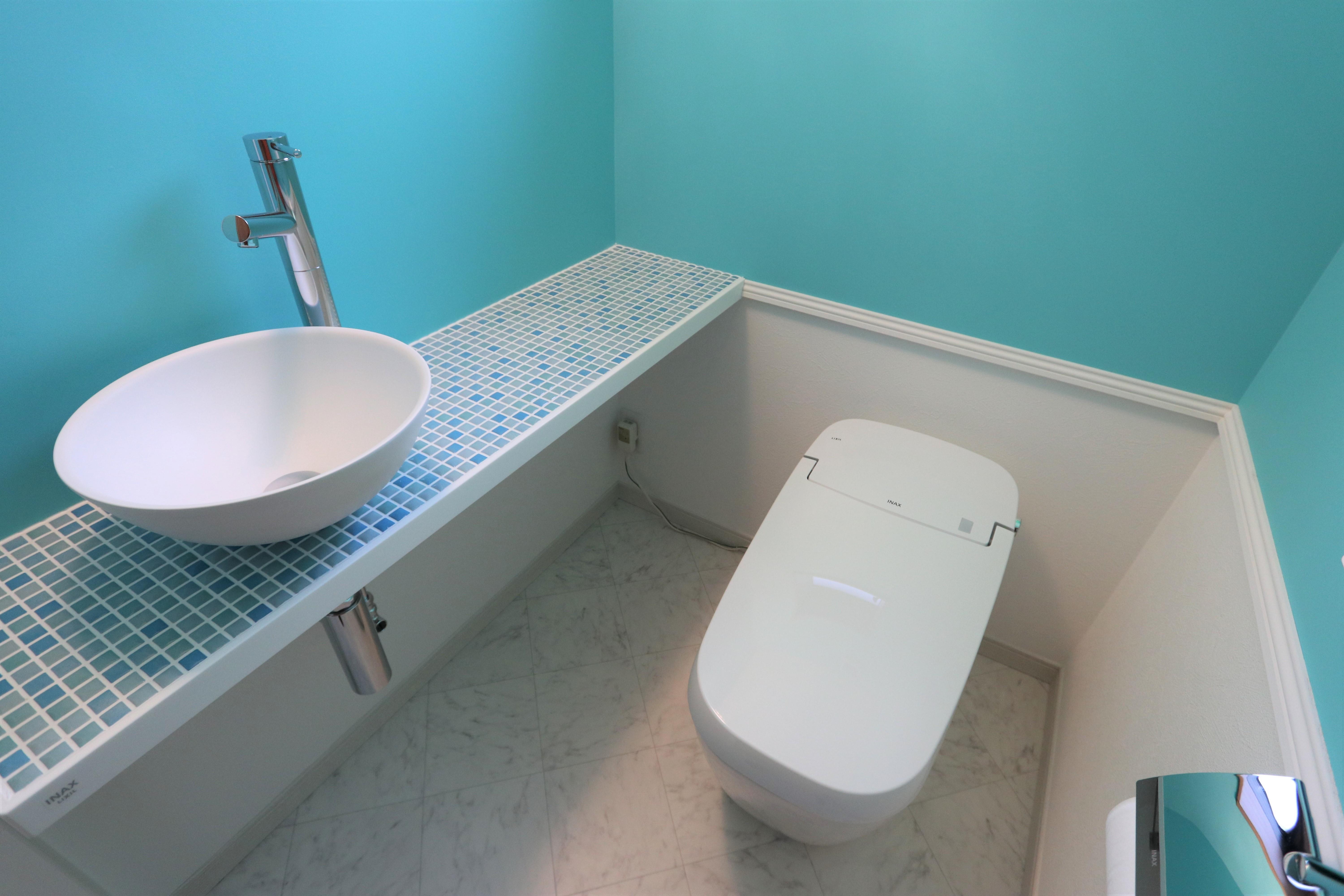 ★タンクの無いすっきりデザインのトイレに替えられました。 ★壁紙の色や手洗い器、棚のタイルなど、トイレ全体のコーディネートがとても素敵なトイレ空間となりました♪