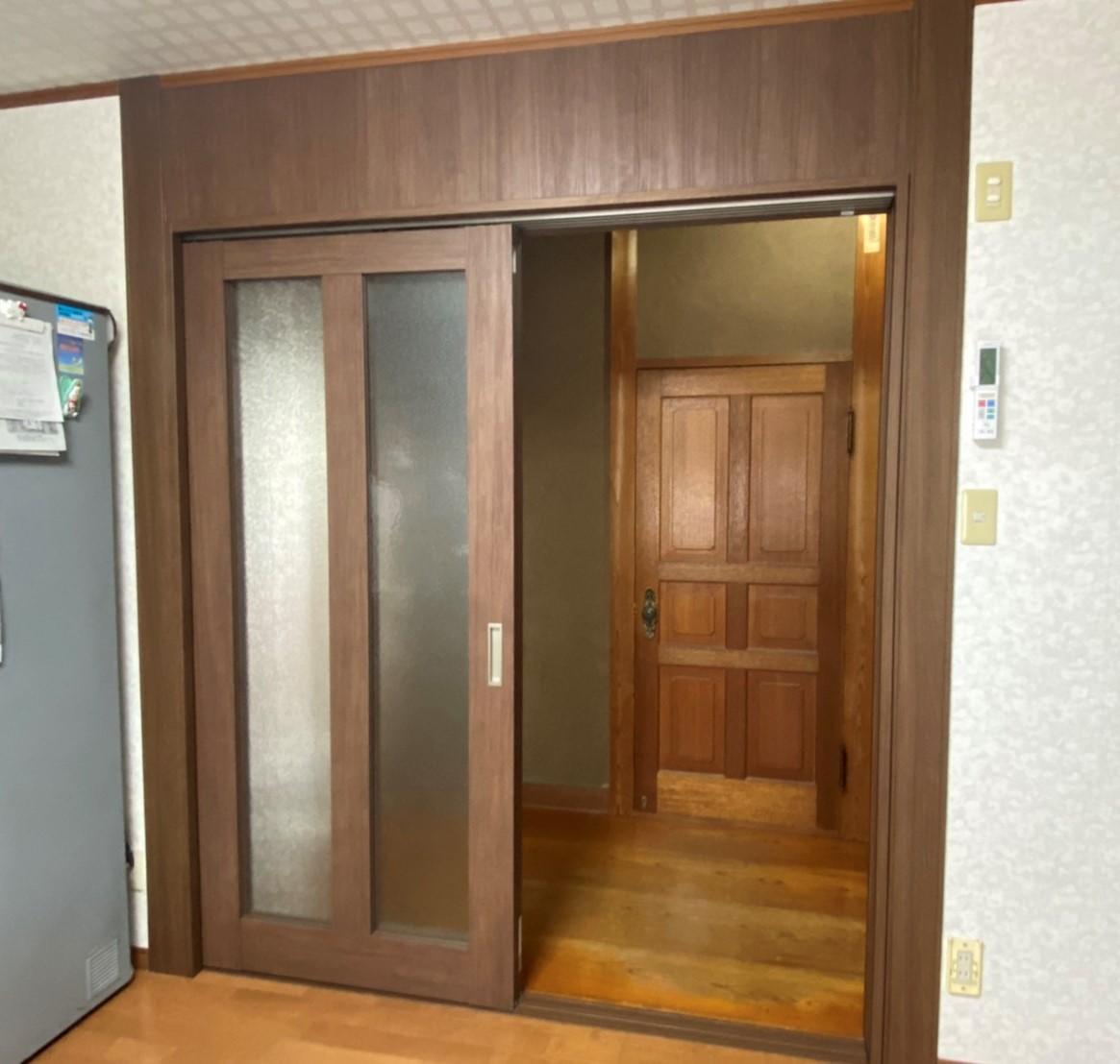 ★台所入口のドアを既製品の建具に取り替えられました! ★古い建具は硝子が重かったり、季節によって湿気で歪みが出て開きづらくなったり、勢いよく閉めると大きな音がしたり…そんな経験はありませんか? ★新しい建具は、金物のレールでガラスが入っていても開け閉めしやすく、勢いよく閉めてもソフトクローズという静かにゆっくりと戸をしめる補助機能がついているため、跳ね返りや衝撃音を防ぎます。