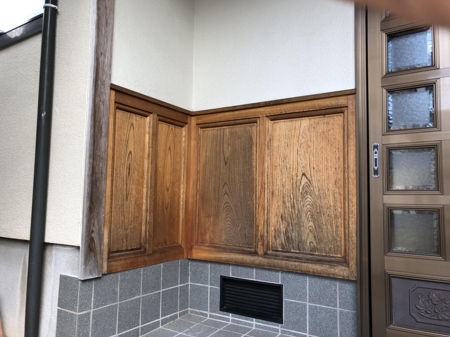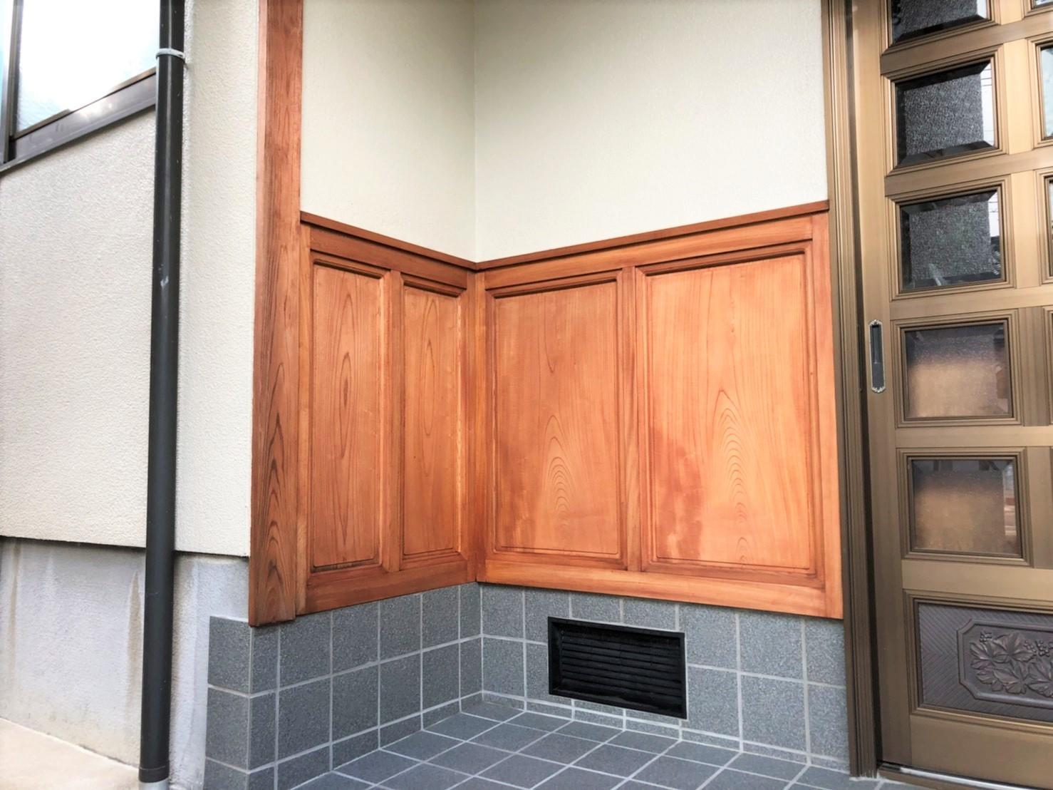 ★玄関前の欅化粧板をクリーニングされました。仕上げは、柿渋仕上げの2度塗りで美しくよみがえりました!